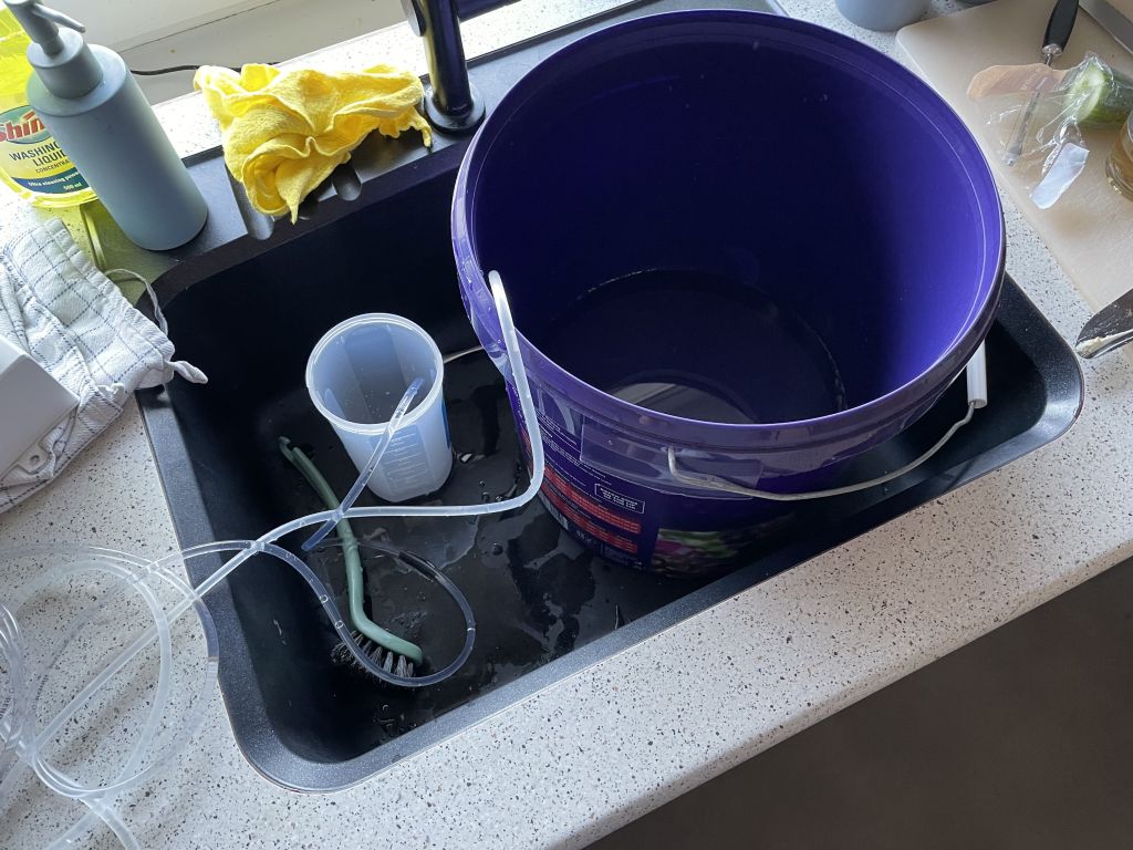 Reaktoren står på bordet og en spand med vand som der puttes ind i reaktoren står i vasken samt en beholder til Kalkvand FRA reaktoren.