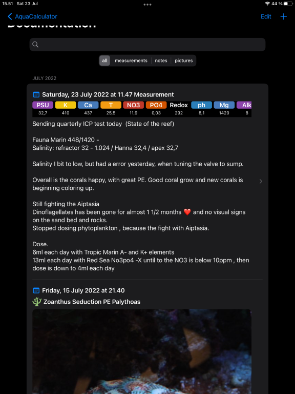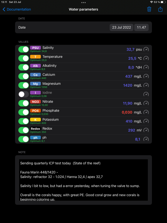 Jeg kan bestemt anbefale andre at fortage målinger en gang om ugen, for at se hvordan ens balje kører og afhængig af antal koraller osv. ICP test hver kvartal, for at få justeret sine sporelementer ind