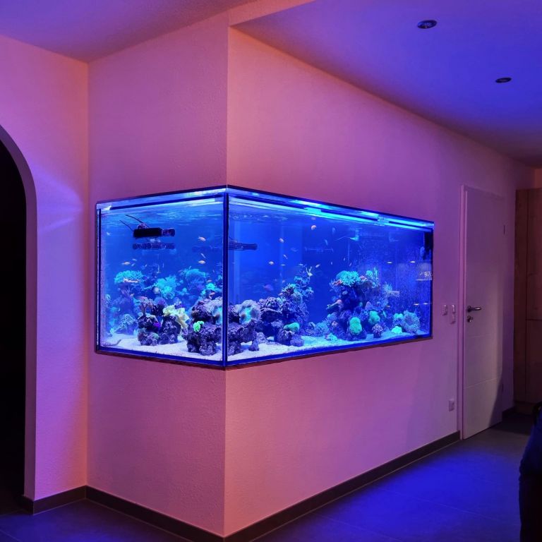 2) Jeg kan indsætte akvariet i en ydervæg, så dets dybde bliver lig en murstens bredde, samt hulrummet i hulmuren, fratrukket en smule flamingoisolering. Det vil kun kræve, at jeg indmurer en overlægger over akvariet, sætter farmacel hele vejen rundt og efterisolerer med flamingo, så der ikke opstår kuldebroer. Så har jeg et undhak i min væg, hvor akvariet kan placeres. I samme ombøring kan jeg montere en stikkontakt over akvariet, samt en strømskinne. Ved at lave intern sump, høj biofiltrering og lav belastning, i form af fisk, kan akvariet vel nemt køres sådan. Pt er det min fremgangsmåde med mine to mindre akvarier. De spiller bare. Men er der noget negativt at sige om placeringen af akvariet i ydervæg? Jeg vil kunne komme til det fra toppen, da der skal være åbent, så der ikke samler sig fugt. Belysning bliver to LED skinner.