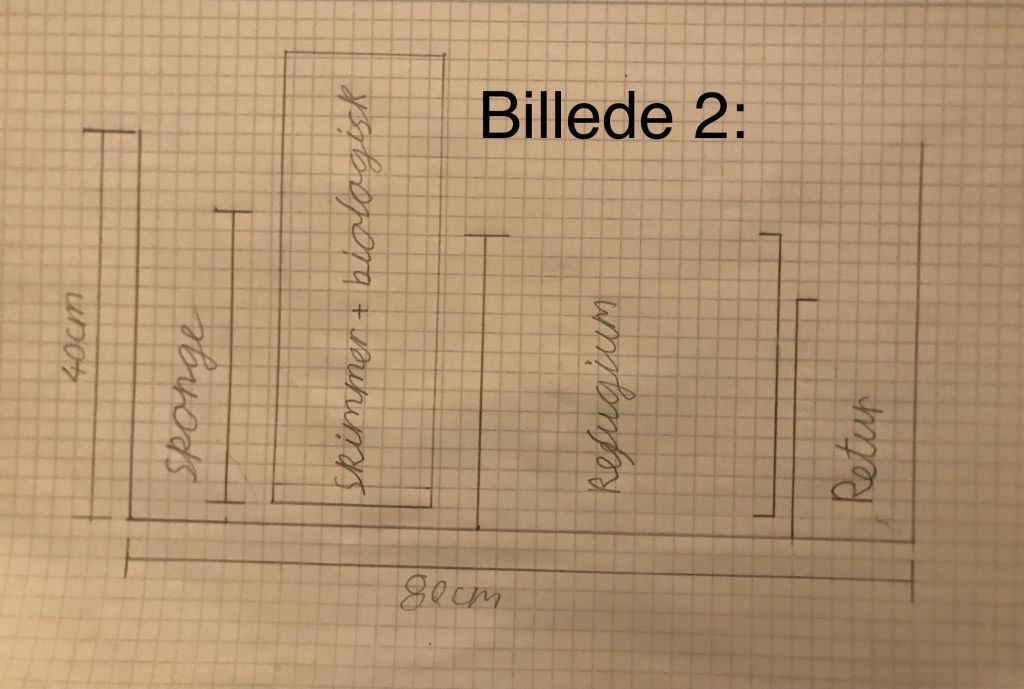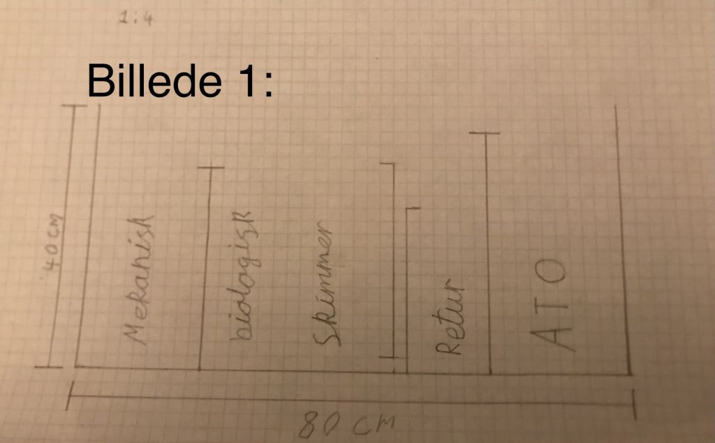 Jeg har lavet en tegning over hvordan den ser ud nu (se billede 1), det er i 1:4, det er ikke en super præcis tegning men forhåbentligt kan i danne jer et overblik over det. Planen er at fjerne auto top off systemet da jeg har andre planner her.