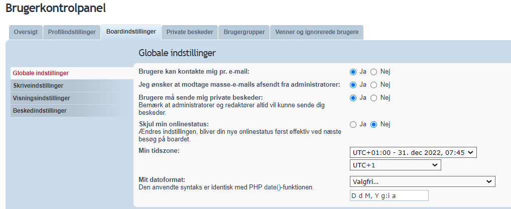 Tryk på dit brugernavn i øverste højre hjørne og vælg Brugerkontrolpanel Her kan du vælge Profilindstillinger hvis du f.eks vil ændre oplysningerne i din profil, ændre adgangskode, lave en signatur eller avatar. Vælg Boardindstillinger hvis du vil ændre boardindstillingerne for din profil. F.eks. om du vil modtage PB'er, mails, om din onlinestatus skal skjules osv osv