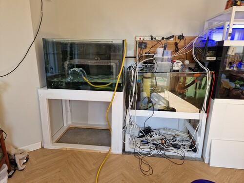 Selve skiftet tog fra kl 10 til 21 sidste lørdag. Alt drillede. Gennemføringer skulle skæres og gik i stykker, slange knækkede, top-off pumpestik knækkede, mit top-off akvarie på 160 liter blev stødt og flækkede - mit bord var ikke kraftigt nok og skulle forstærkes med reglar fra akut tur til Hjem og Fix.