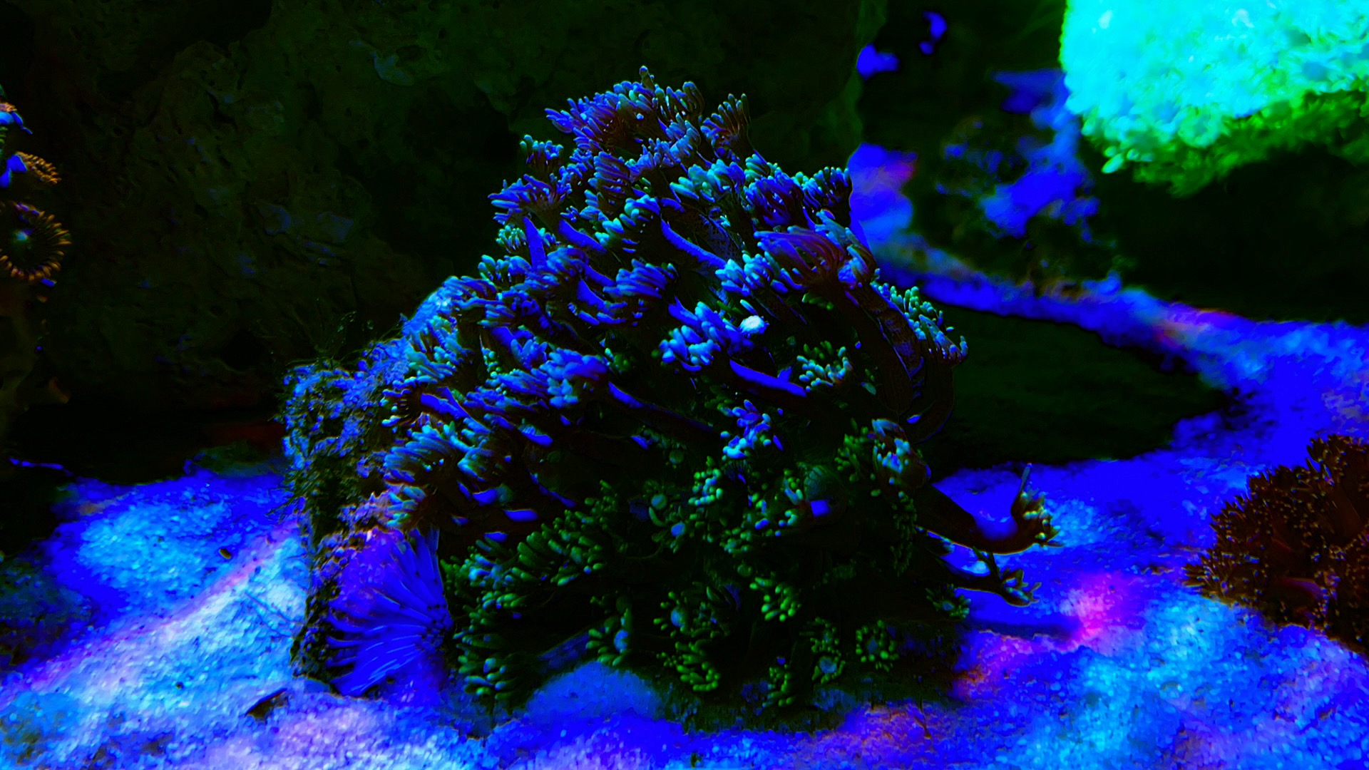 Fik fingre i denne flotte Homophyllia mix klump i december og den bringer mig daglig glæde :y :W. Jeg kan se der sidder lidt zoas på den også, så nu er spørgsmålet: