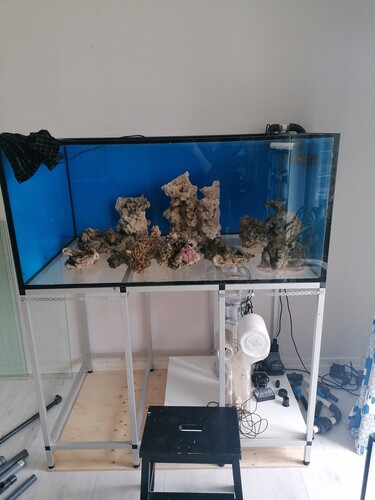 Så nu går jeg og hygger at få akvariet placeret i lod og vatter samt forankret i væggen, da porsastellet er ret højt. Ca 100cm