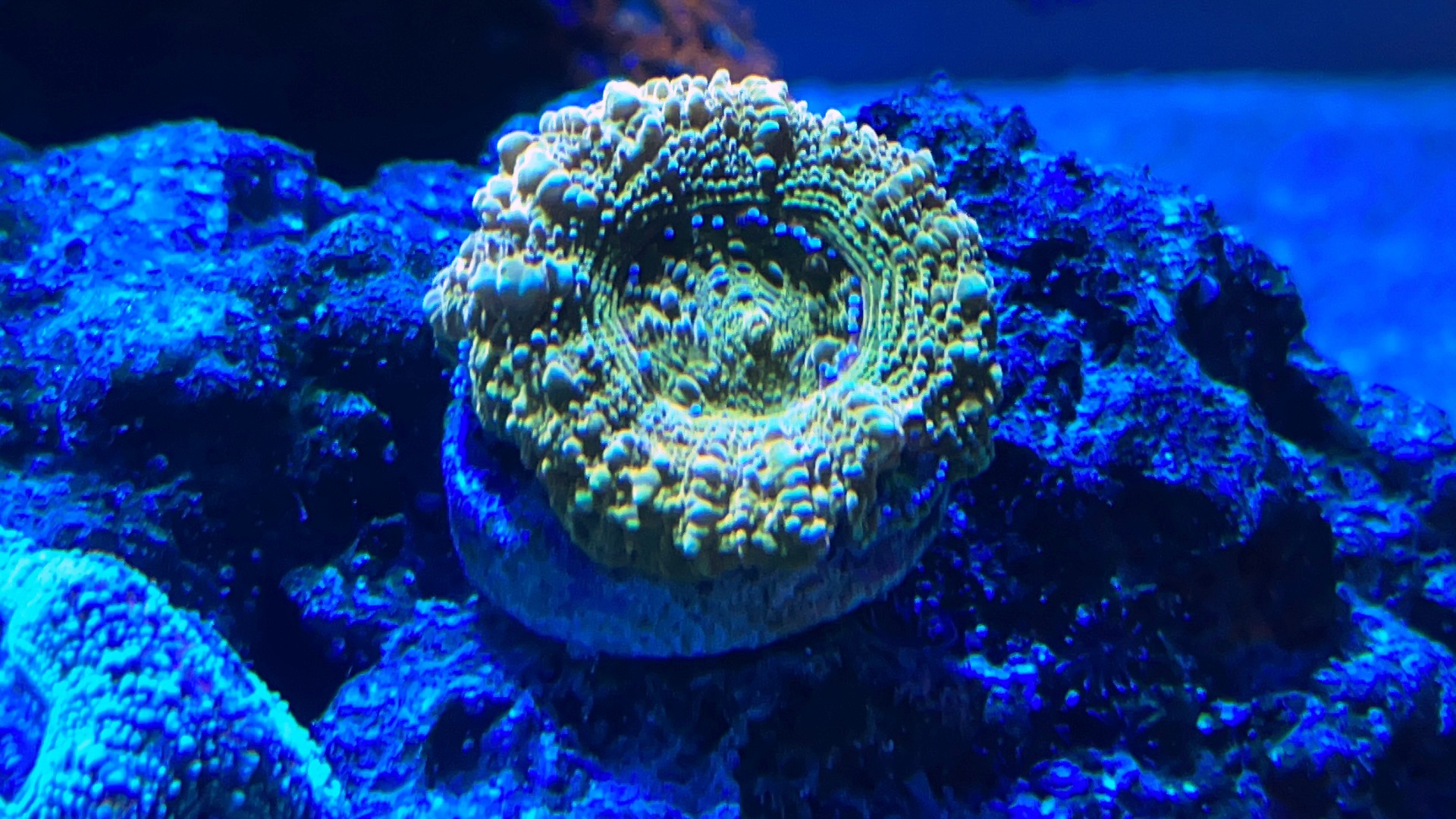 Den er købt v en forhandler som en (speciel og MEGET dyr) goniopora. Jeg tror nu nok det er en Bernardpora (gonioporas lille fætter). Se evt her. Der er 3 typer inden for den “familie” goniopora, alveopora og bearnardpora. De kaldes populært “flowerpot coral”. Fede lps koraller med KÆMPE farve og udseende variation.
