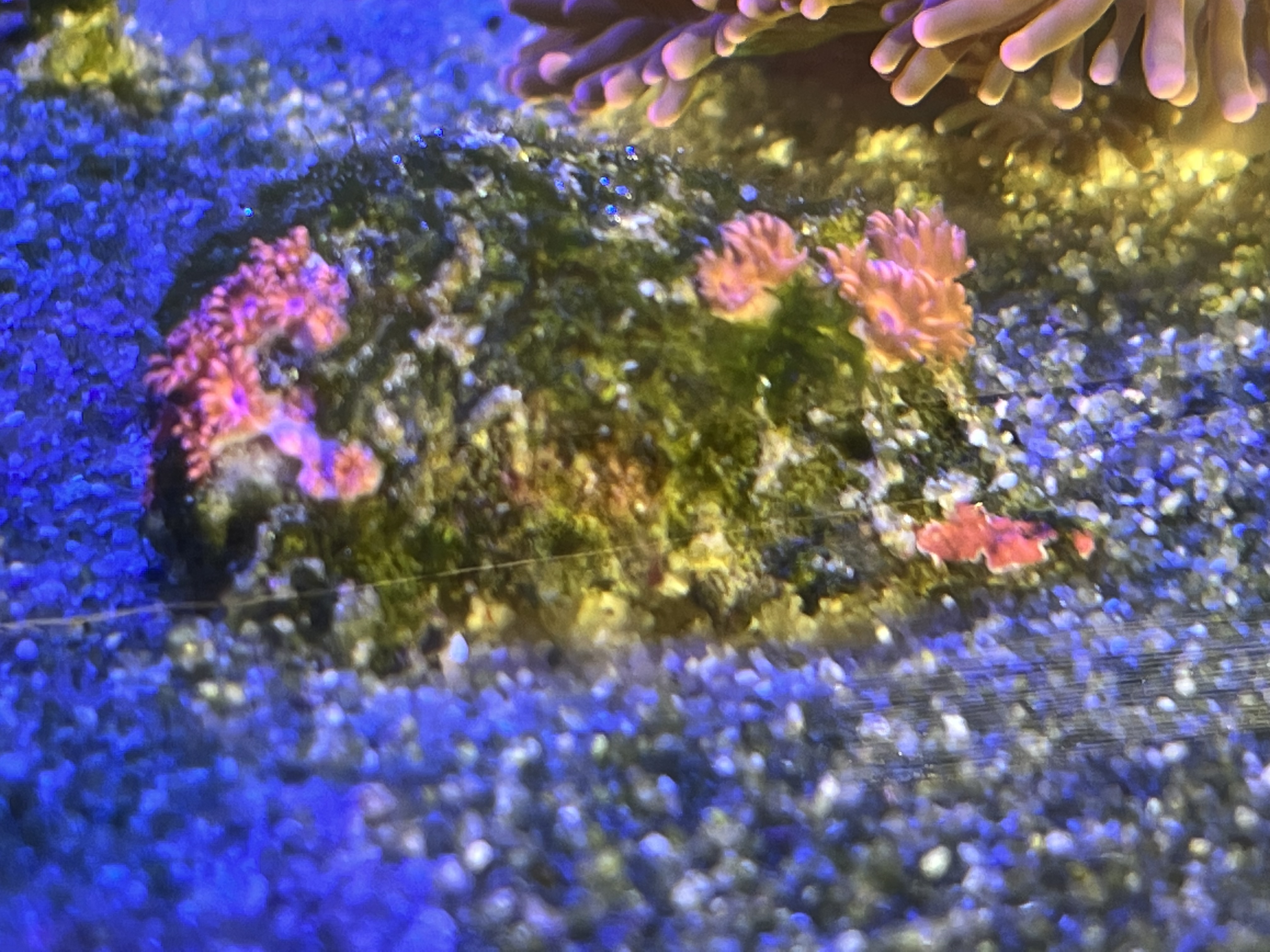 En flok leopard gylter. Jeg har observeret en lille bitte smule flatworms, dem skal de nok få bugt med. Har også fået en lille bitte smule boble alger ind med en koral. Æv. Foxface tager dem han kan nå. Resten skraber jeg af med en pincet.