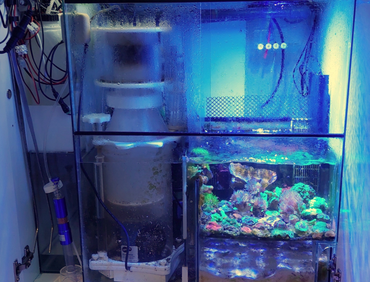 Hel-limet custom sump lavet i 4mm glas og med skyderuder, som mindsker fordampningen. Der er skummerkammer, frag-område, refugium og returkammer. Nederst til venstre i skabet ses et limet RO-kammer på ca 15L