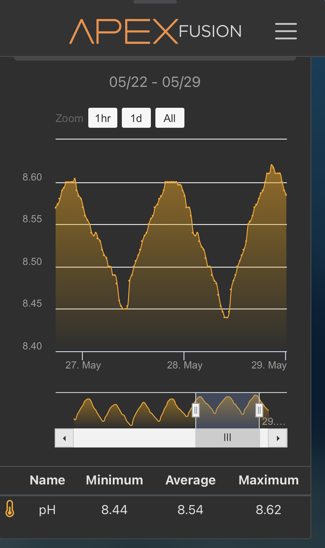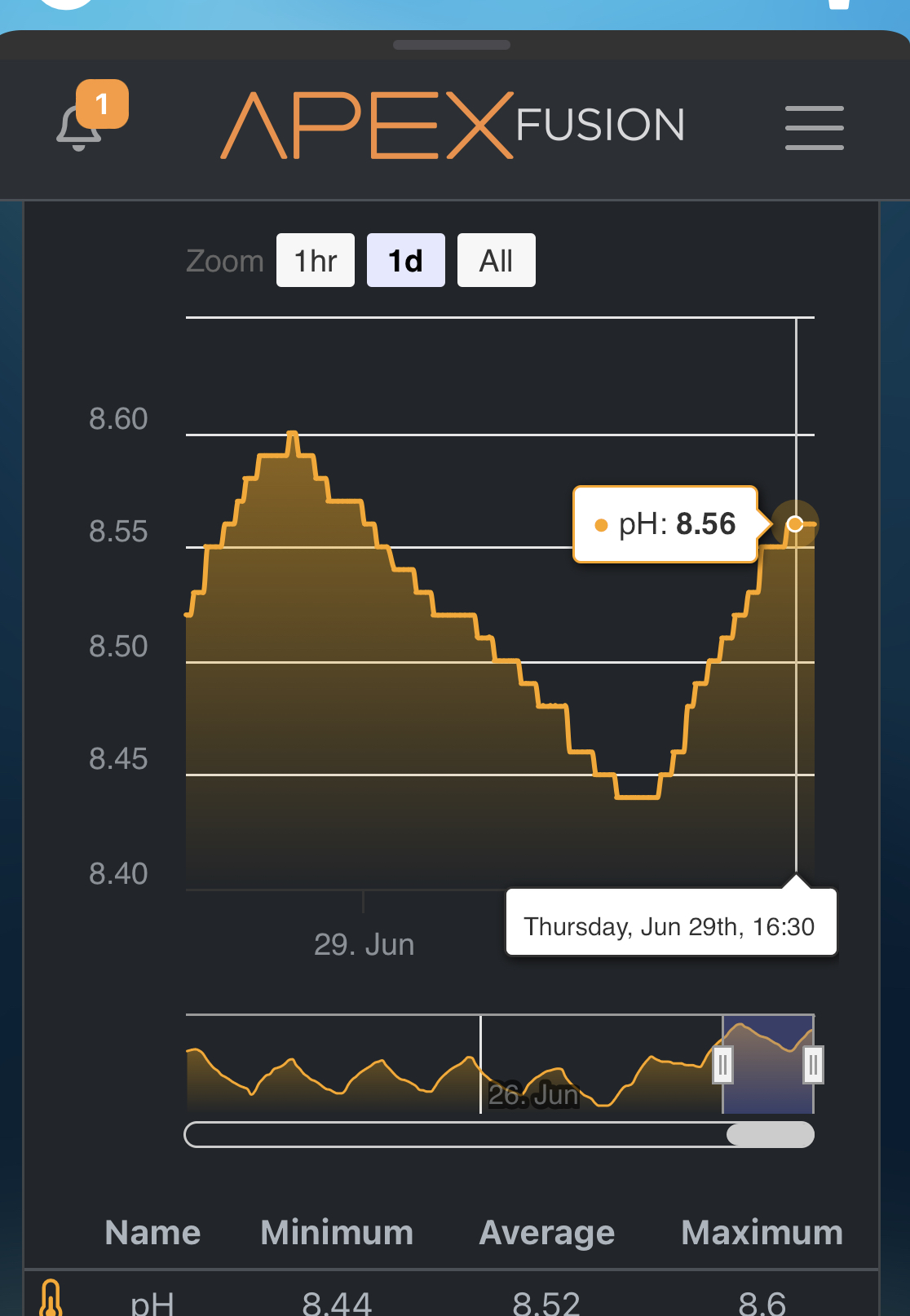 Har sat apex’en til at give mig en alarm hvis pH kommer over 8,65…..