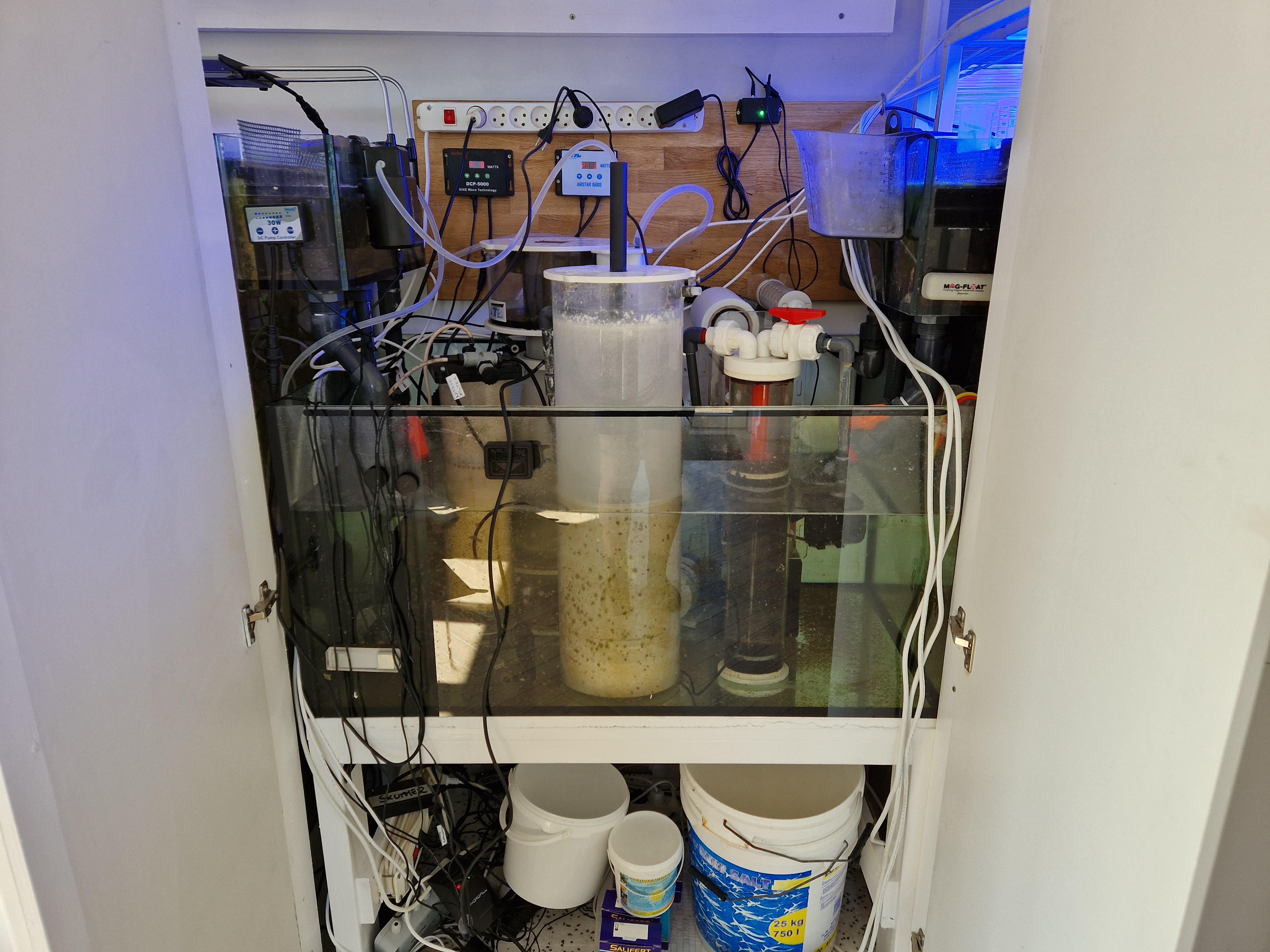 720 liter og 150 liters sump, Philips CoralCare gen 1 lamper, Nyos Quantum 220 skummer, MP40QD mobius og Jebao DCP10000 retur. Samt GHL profilux.