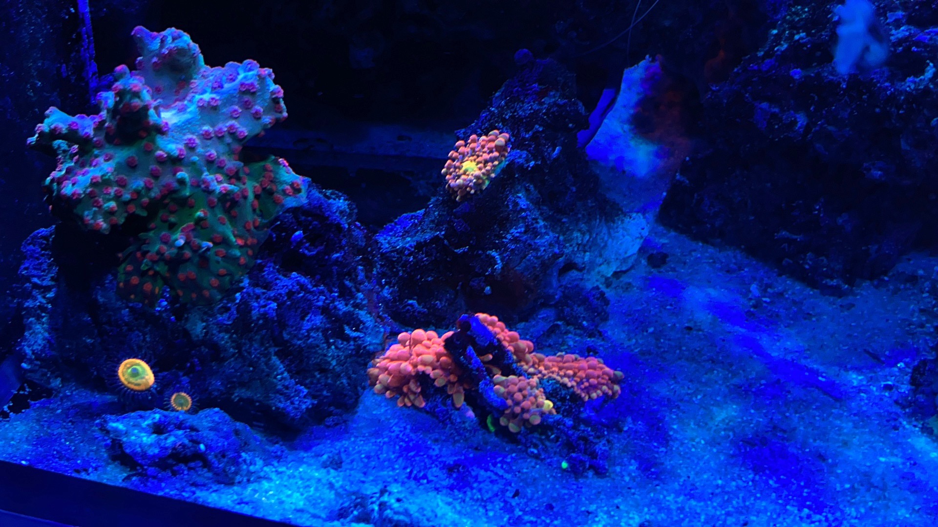 3. Sollys. Jeg kører jo med ret lidt PAR, da det primært er en lps balje ( har pt 2 stk Plating monti HELT oppe under lyset, som det mest lyskrævende (sps)). Så det næring der u-undværligt ophobes i sten, blir alge brændstof, som så gror godt i sollys.