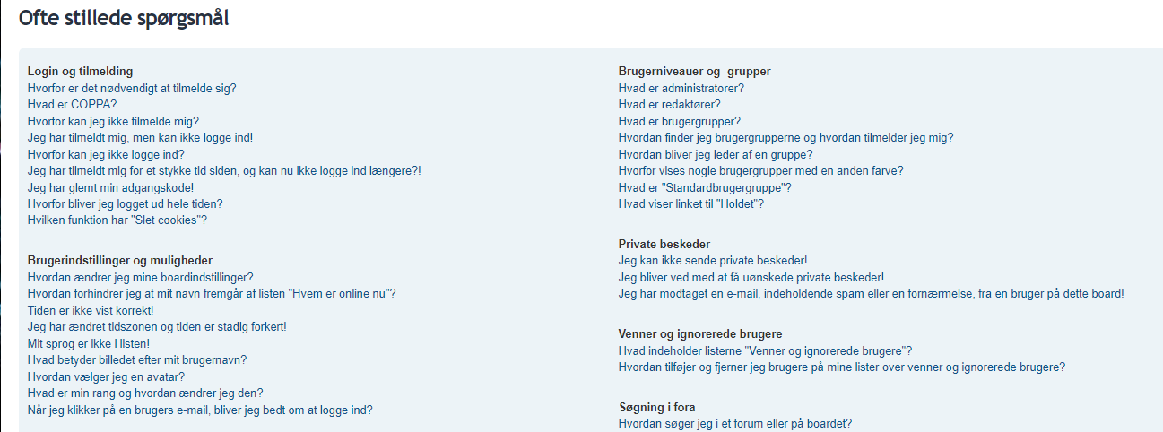 OSS (ofte stillede spørgsmål) findes øverst på siden, ved siden af "Hurtige links" En rigtig nyttig side der har et svar på (næsten) alt, om en phpBB platform, som saltvandsforum.dk bruger.