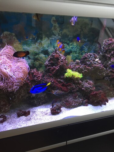 Ville først starte op uden sump, derfor blev der købt en Deltec MCE600 skummer, men den ide blev skrinlagt, så der skulle findes på at lave overløbskammer, samt havde ikke mod på at bore hul i bunden, for at få rørføring til sum. Søgte på nettet, og fandt en video på youtube med DIY Aquarium overflod PVC. Har kørt med det siden 2015, uden problemer. I selve akvariet fik jeg bygget overløbskammer, samtidig have jeg et lille 54l, som blev lavet om til sump med boblefælde. Levende sten blev hentet hos Klovnfisken på Amager. Vores første fisk var Ocellaris klovnfisk, sammen med en anemone. Hunnen blev syg, og herefter spist af anemonen. Det var lidt barsk at se, at der hang en død fisk ud af anemonens mund. Fik en ny Ocellaris og her opdagede jeg, hvordan de kan skifter køn. Havde det par indtil i foråret 2023, hvor jeg troede, at man kunne have 2 par i samme akvarie. Blev frarådet det her på forrummet, men flere på Facebook mente, at det kunne man godt.