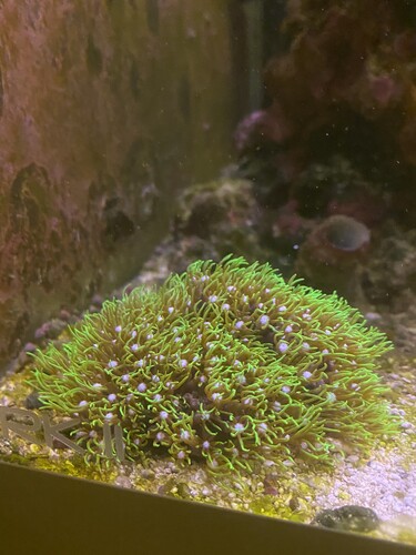 Det største problem nu er at vi har 2 BTA, som ikke kan fjernes uden at hele stensætningen skal op. Købte en som selvfølgelig ville sætte sig fast under en sten/hule – efterfølgende har den delt sig, og begge disse BTA optager 1/3 af akvariet, og selvfølgelig i midten. Hvilket gør at det er svært at få plads til koraller som ikke vil blive generet af BTA. Mens dette skriv blev til har den delt sig så jeg havde 3, og har fået fanget de 2 op. Så nu er der kun en som fylder midten af akvariet.