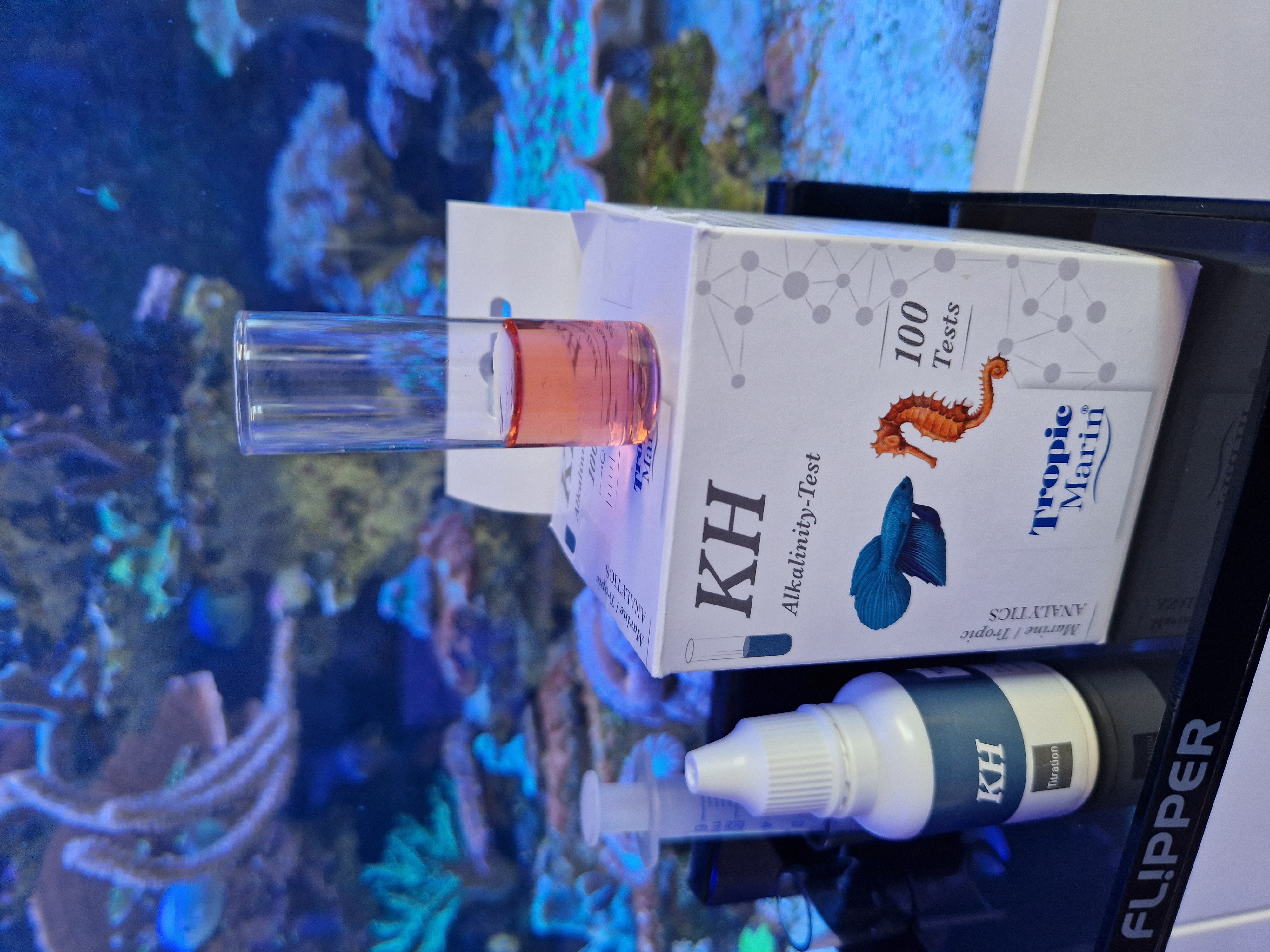 Den første test er vores "normale" KH test. Det er en titrationstest med kun én væske. Der skal ikke dryppes noget farve i først, det gør den meget nem og hurtig at bruge.