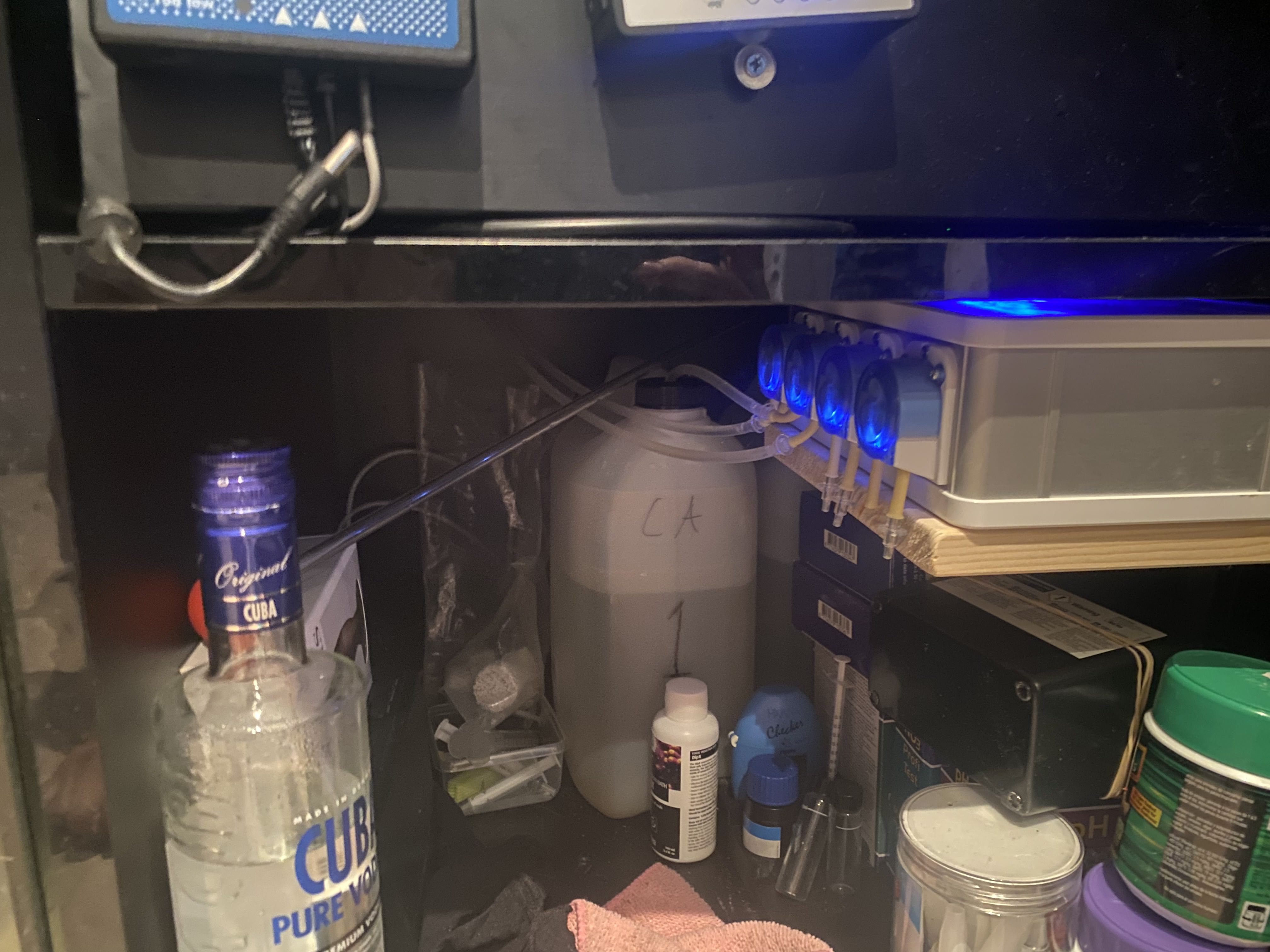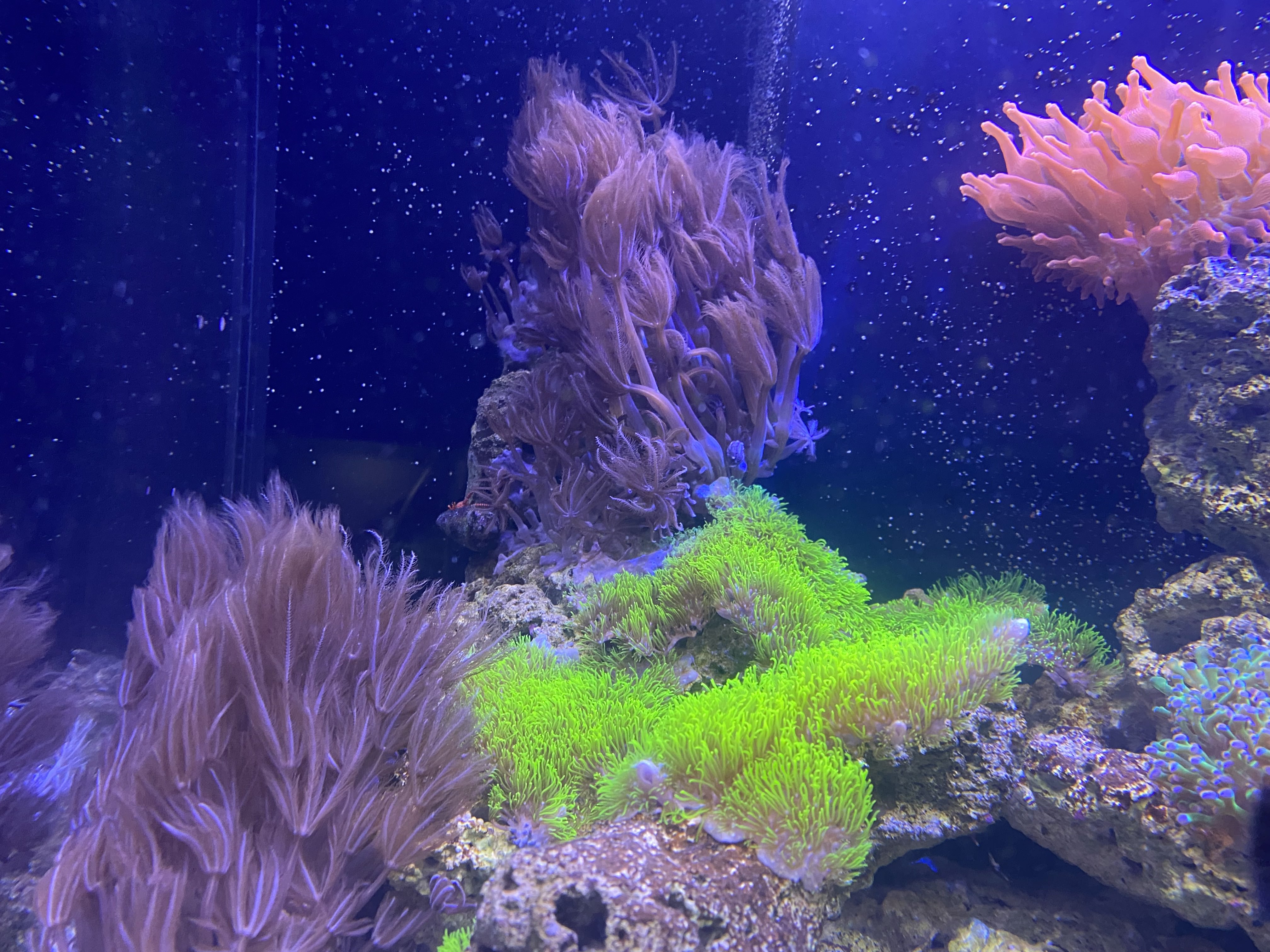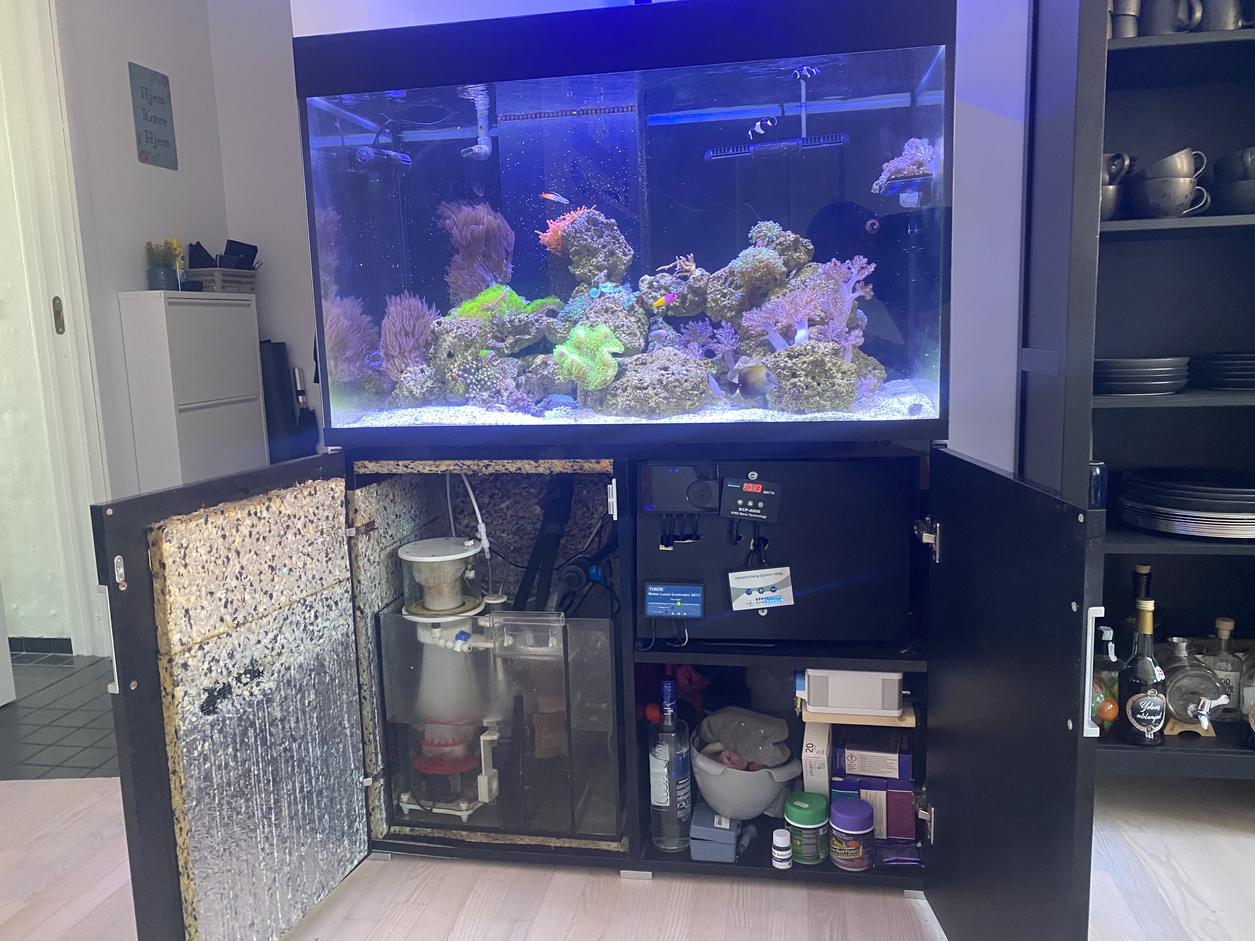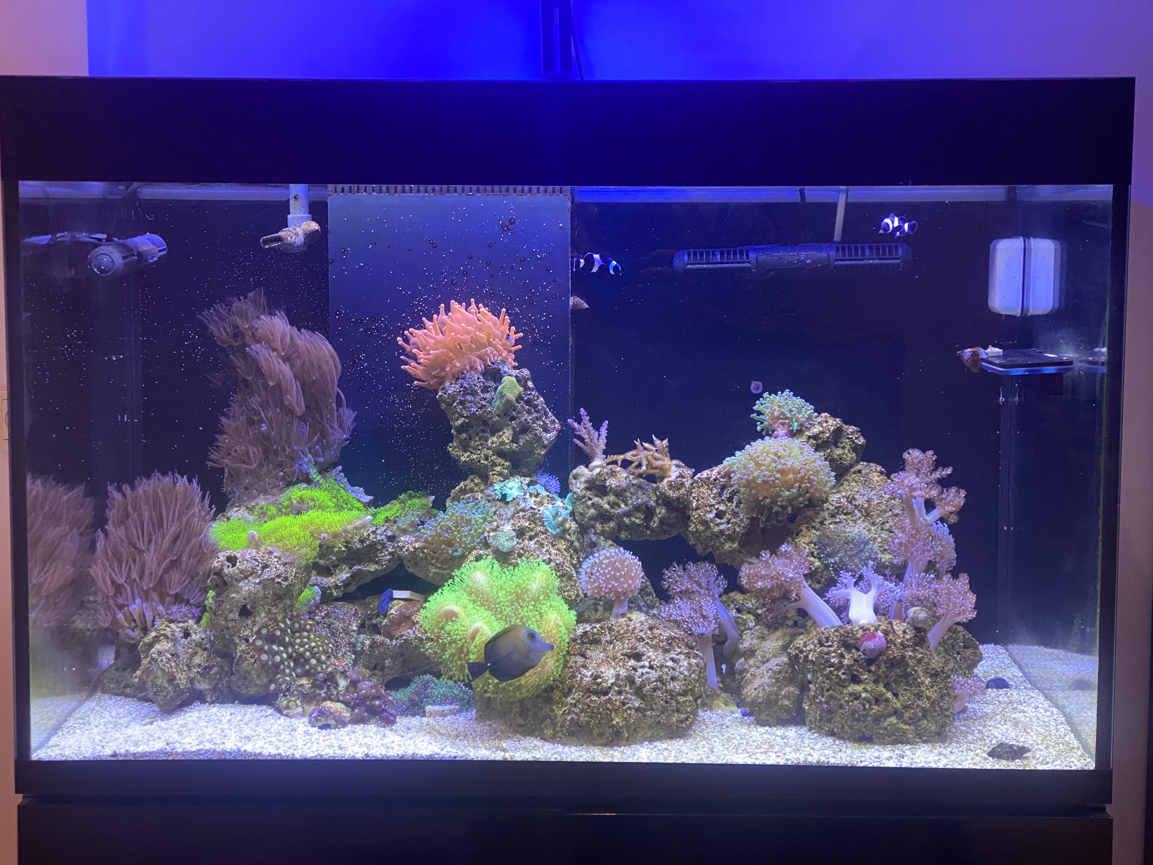 Det gik rigtig fint af et første forsøg med saltvand, og jeg havde mest problemer med nitrat og fosfat, men fik senere mere styr på det med lidt VSV vodka dosering og mere faste vandskift. Det bestod primært af en del bløde koraler (Stor koloni af sinularia) og lidt forskelligt LPS og zoa. Af Fisk var der et par klovne, Orcide Dottyback og en Blennie.