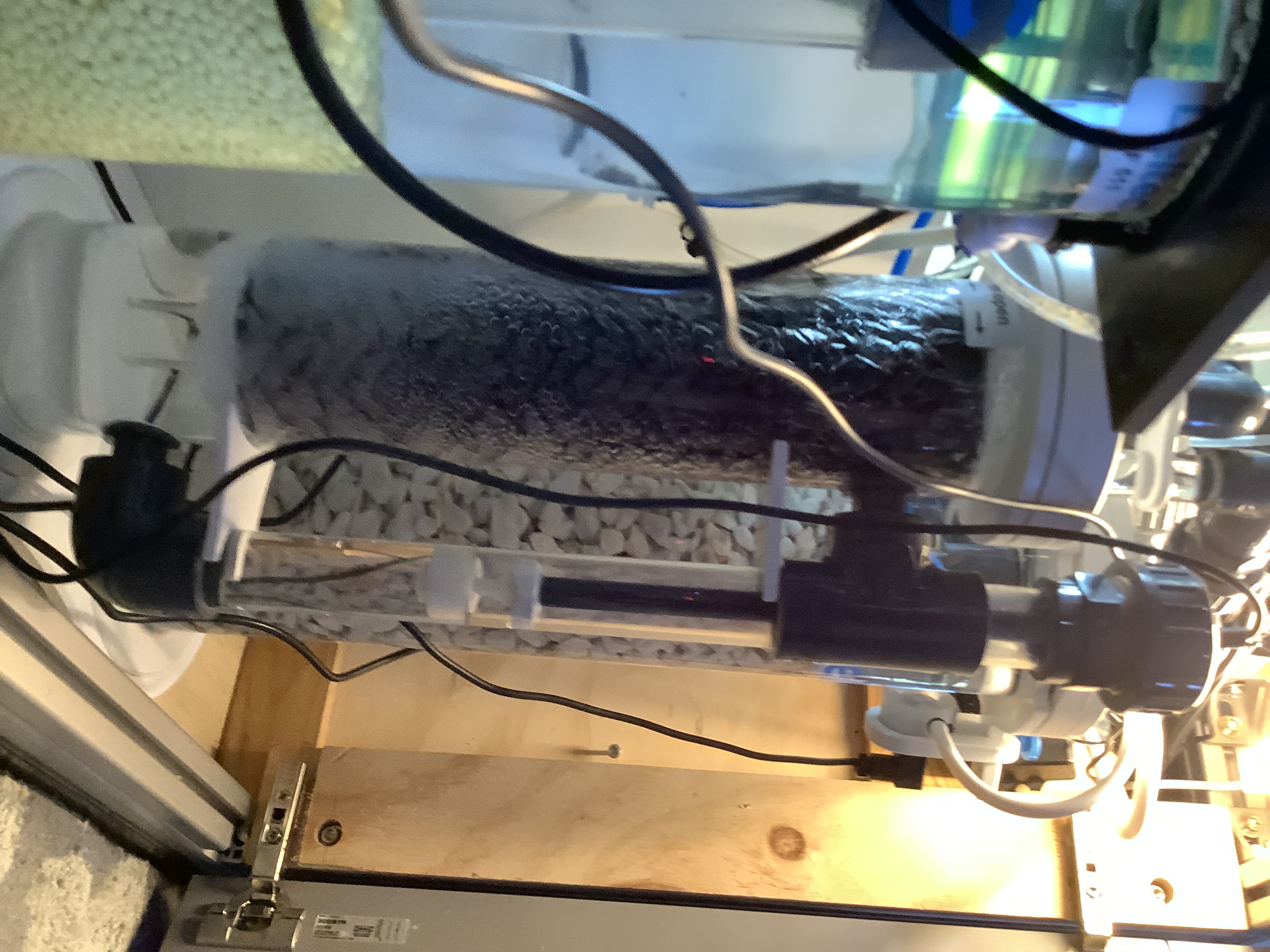 Jeg har et Reefer425 som du selv kender. Jeg har en lille scrubber på som jeg recirkulerer fra skummer koppen. Jeg tilfører ca 120gr frisk scrubber medie hver 14 dag. Jeg tilfører gerne når den når under 8,2.. så har jeg en pH på 8,5 om eftermiddagen og 8,3 om morgenen..