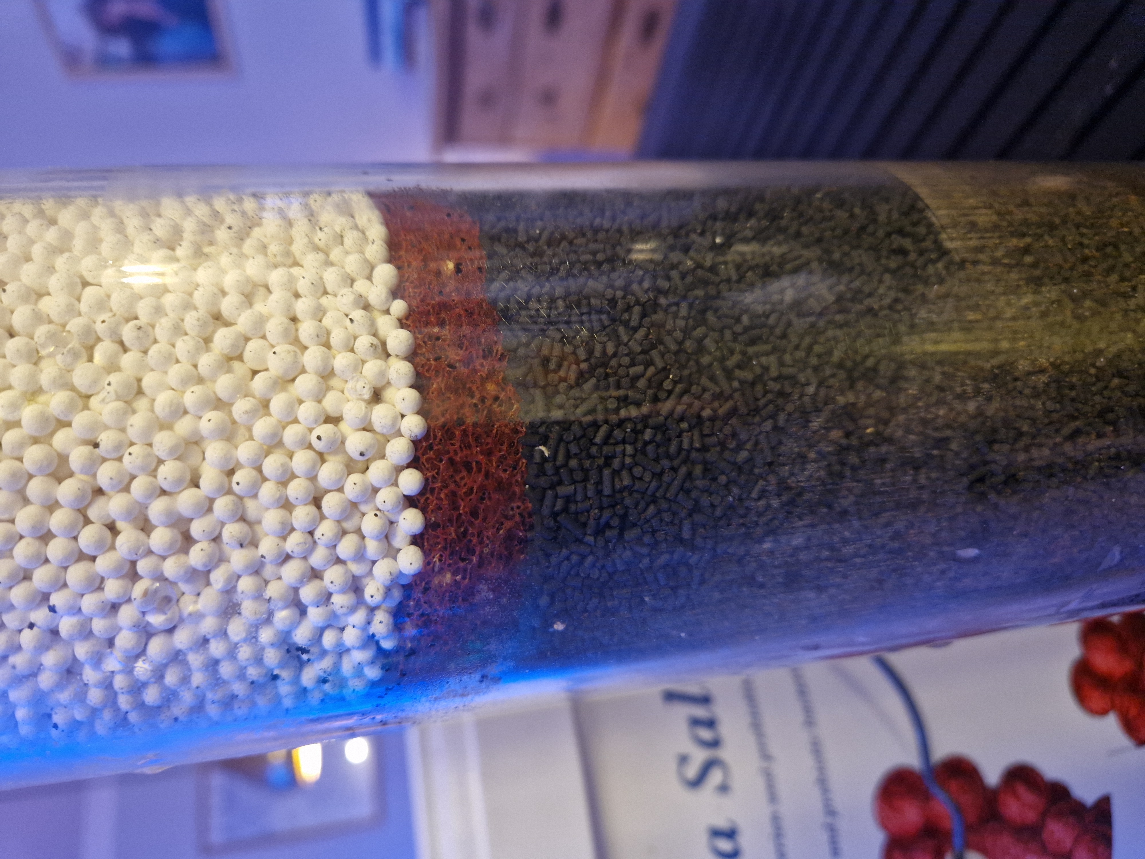 Mit nye nitratfilter laver 180 liter vand med 0 i nitrat pr døgn med max flow. Men det er for effektivt og for mange svovlkugler. Der kommer slimlag og det lugter af rådne æg. Så søndag kommer en tredjedel kugler op