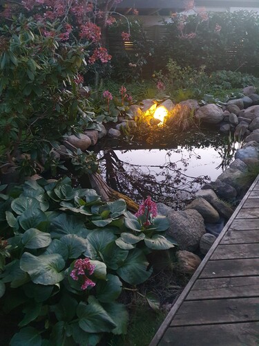 Op i r…. Med den havedam ( ellers et fedt lille mudderhul du har der!). Jeg syntes det er blevet rigtigt fint. Og fedt at se med det klare fine vand i noget rigtigt lys! Nogle planer mht fisk?