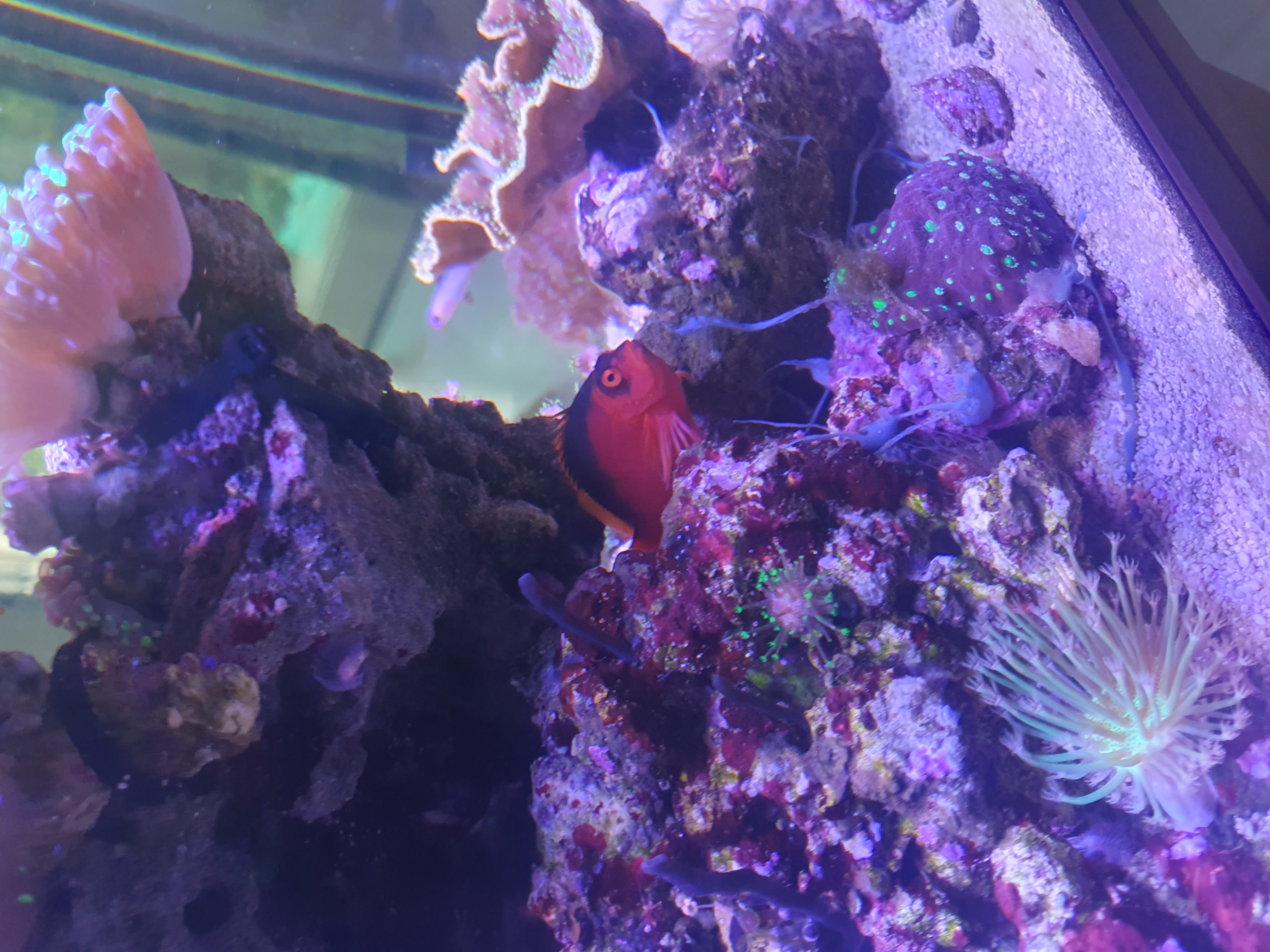 Første beboer blev en rød koralvogter for lidt tid tilbage og så idag kom der en lille mandarin, som den gamle røde koralvogter ikke er særligt gæstfri over.