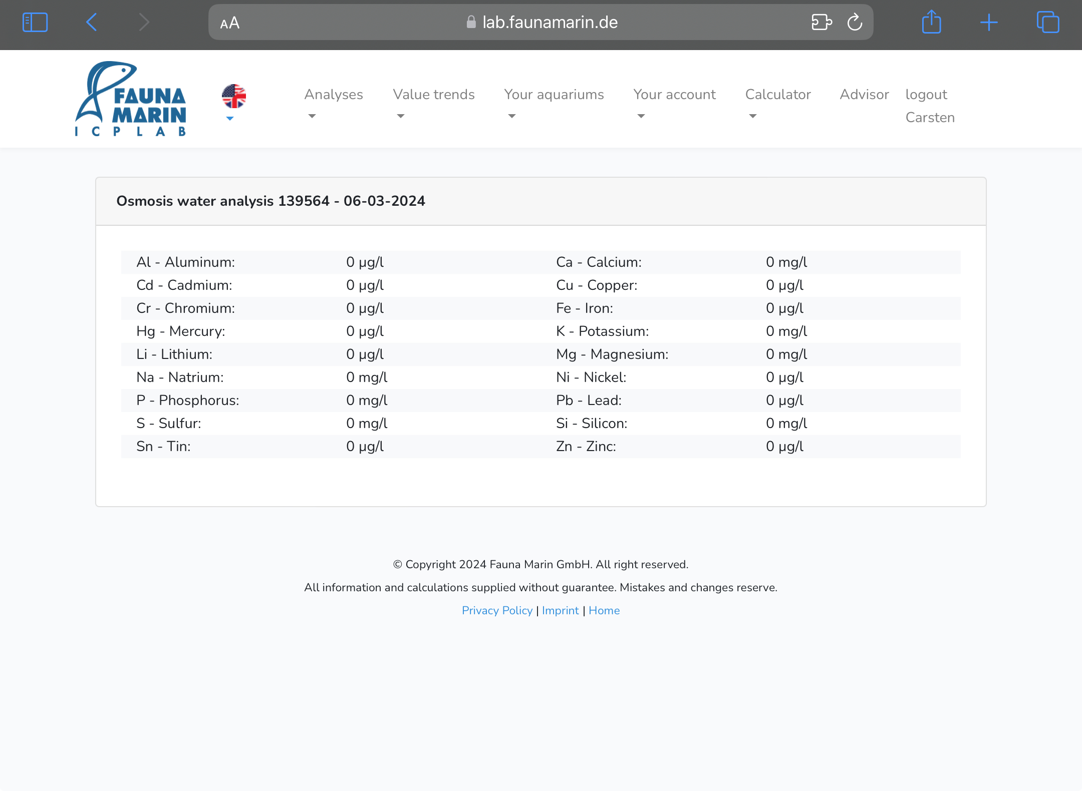 test på frisk blandet saltvand? Det er noget med at mangan er en del høj?