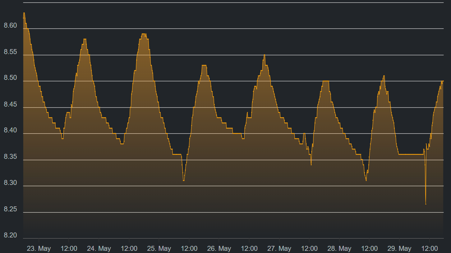 3. pH har tidligere toppet omkring 8,1 (7,7 -8,1) mest 7,8 - 8,1. Jeg logger ikke kh.