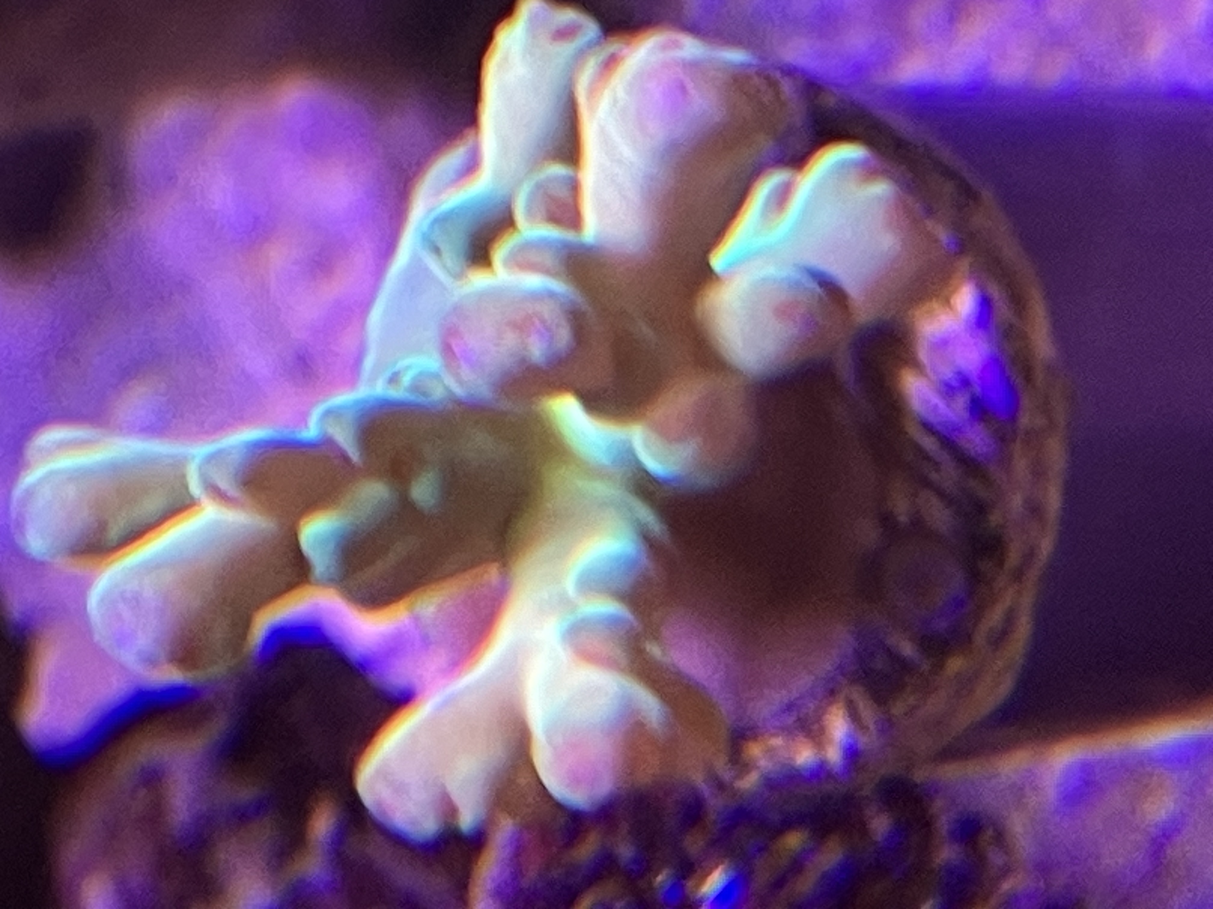 Pt er det rigtigt svært at se, da et nyt fragtment gerne går lidt i stå og ser kedelig ud imens den vænner sig til de nye forhold, men den har flotte fluoriderende grønne farver med blå polypper, hvilket ikke rigtigt kommer frem på mine dårlige billeder...