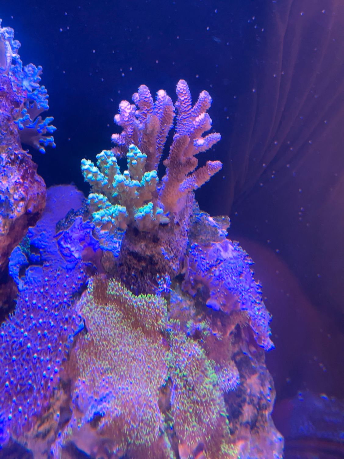 Lidt nye koraller fra en flink akvarist i Viborg og så lidt fra Tropeland :) en skrig grøn Torch, en gul torch jeg fik med billigere som jeg håber på kommer sig, blå acropora, lidt grøn montipora og en gul/lilla montipora. Sorry jeg ikke kender præcise navne 😁