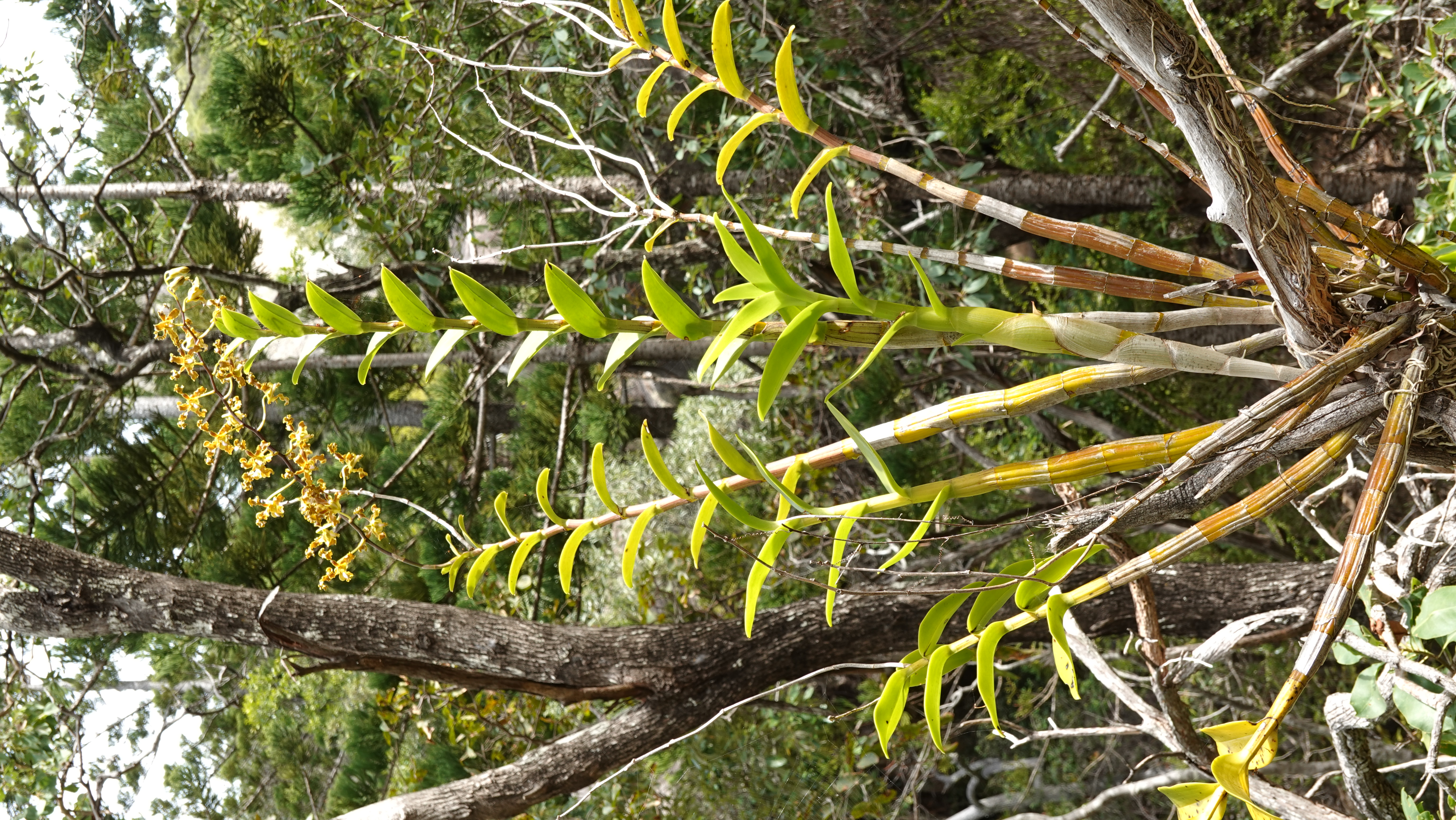 Og selvfølgelig en masse orchideer. Her er en Dendrobium discolor. Den er ikke egnet som potteplante - den kan blive flere meter høj. Vi så flere som var mandshøje, blandt denne her i blomst: