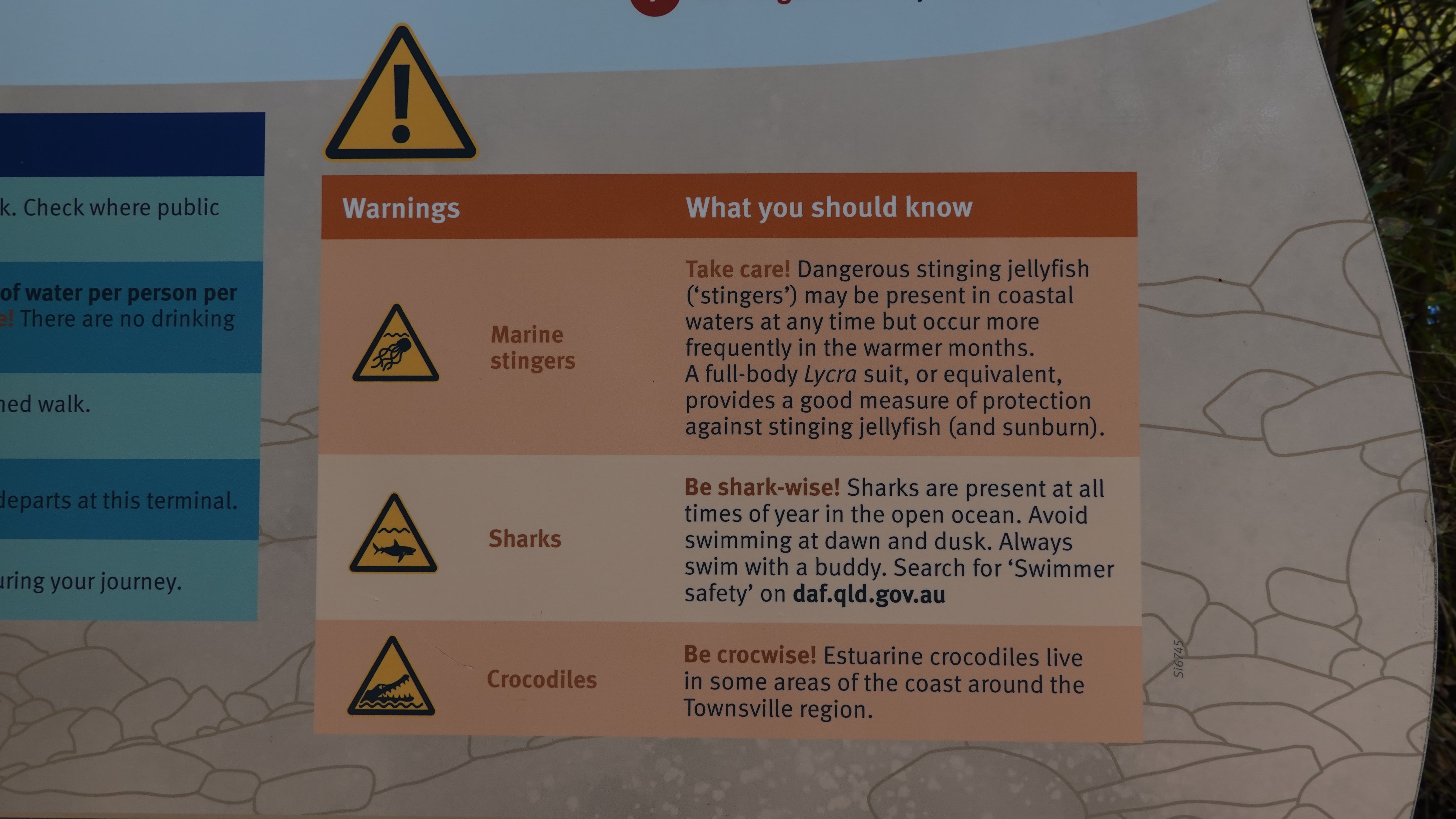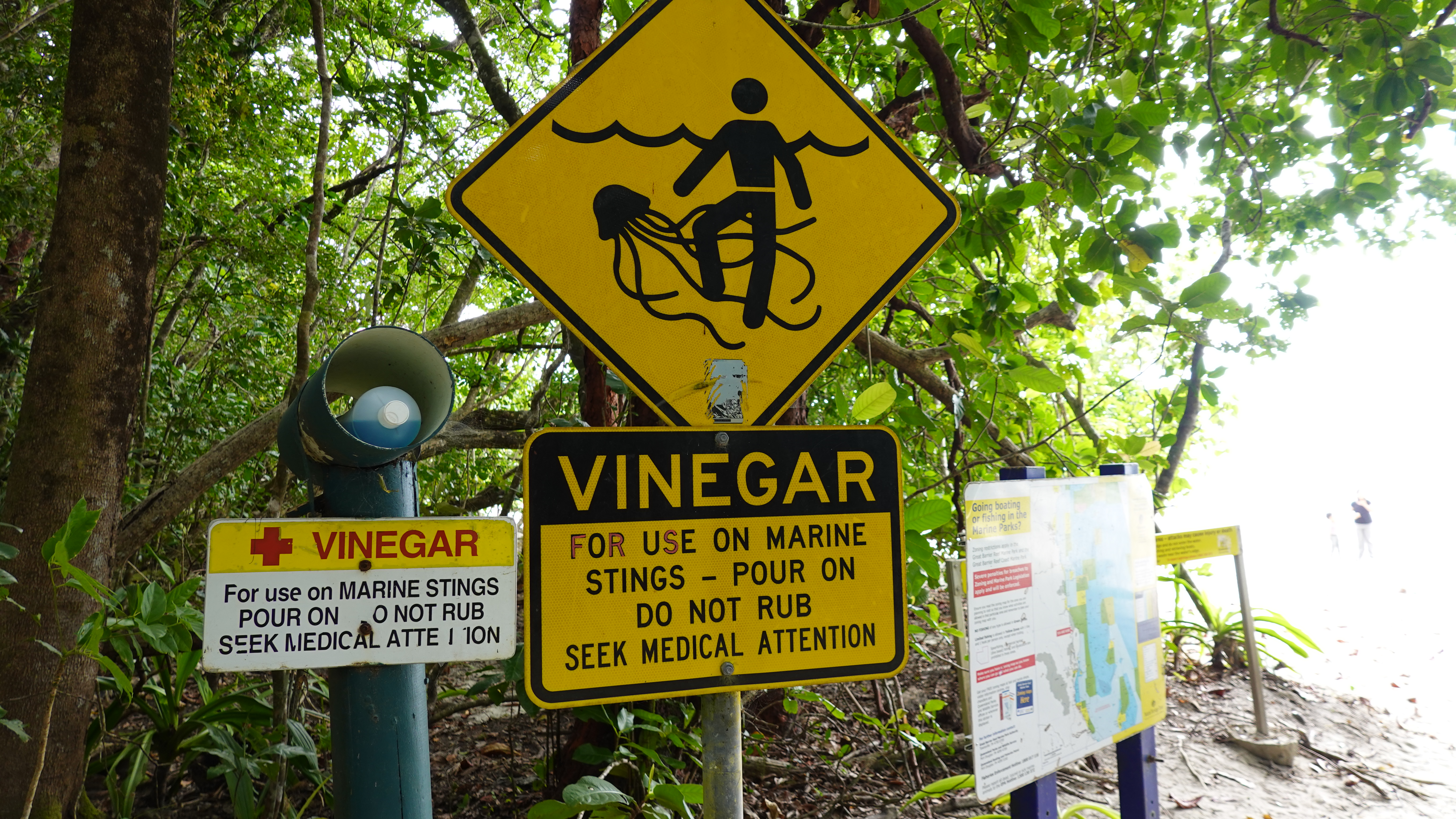 Godt nok er dette her Saltvandsforum, men på alle strande i det tropiske Australien mødes med sådanne skilte. Hvert år er der dødsfald pga. box jellyfish, krokodiller og hajer. Det tager lidt af lysten til at snorkle...