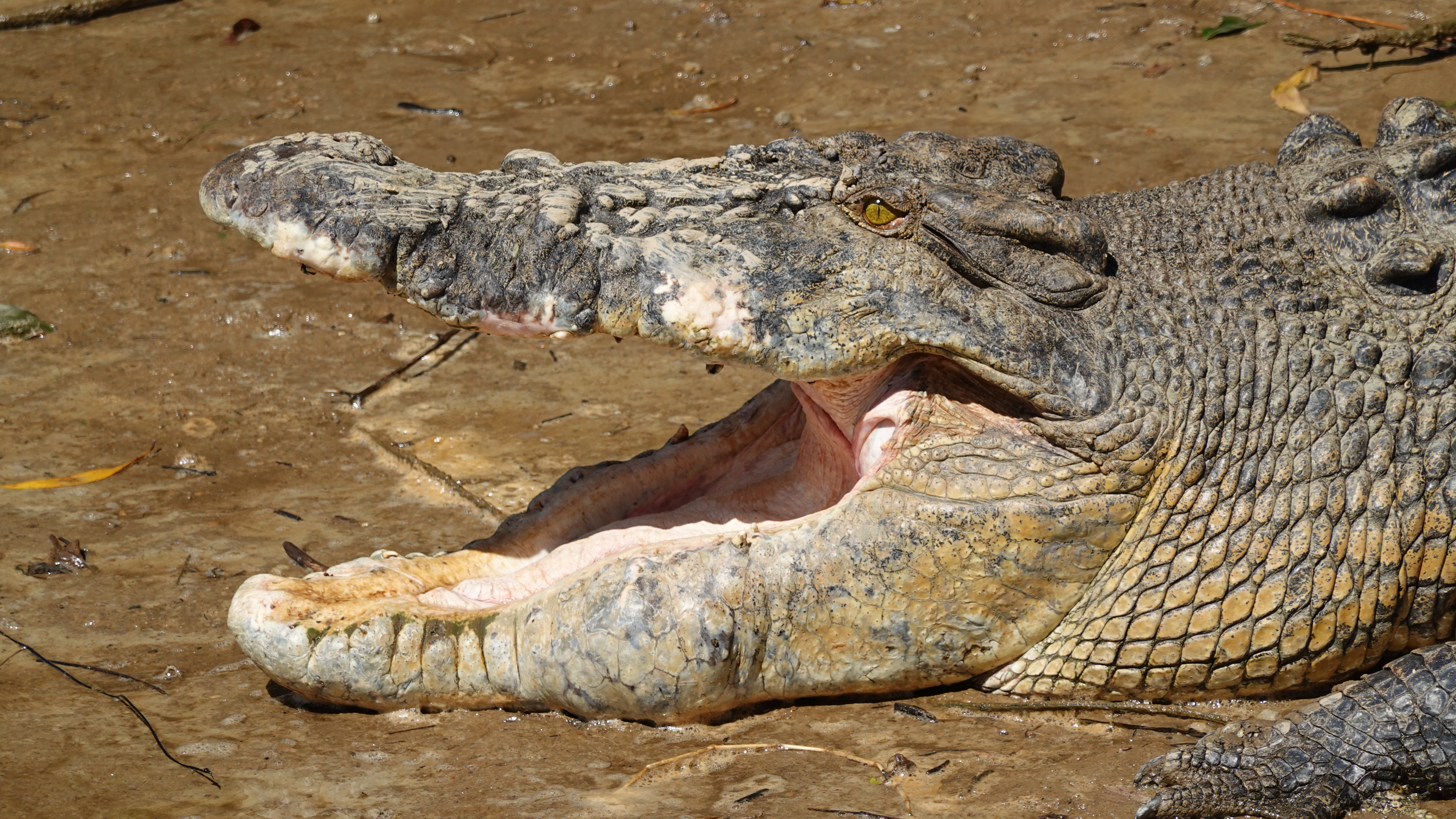 Og den er god nok. Der ER saltvandskrokodiller. Denne her har ingen tænder, men den er alligevel den dominerende han i floden. Selv om den er tandløs, havde den ugen før taget en ko der ville drikke af floden. En krokodille på fire meter har et voldsomt bid, med eller uden tænder...