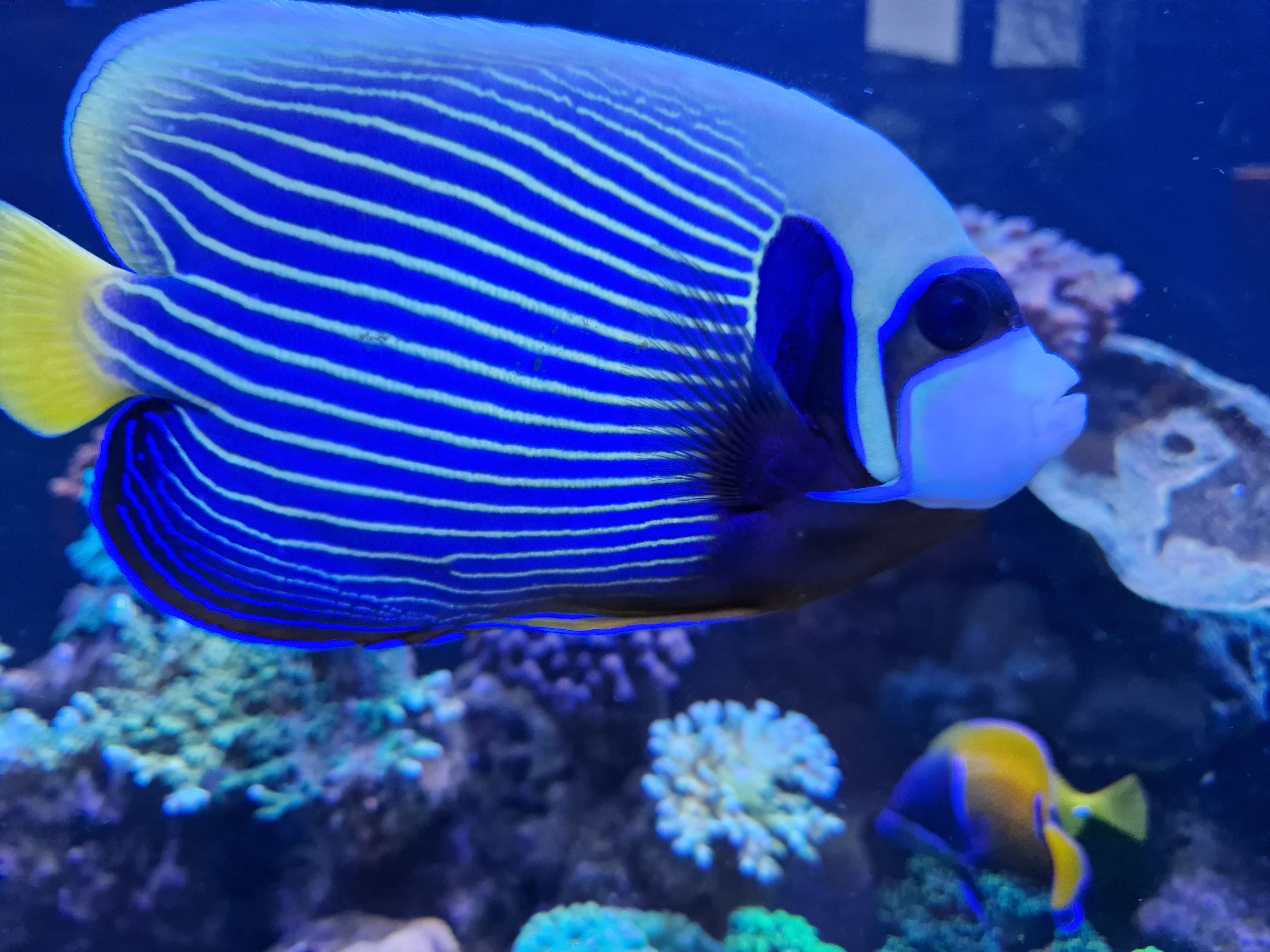 Den lever af flagefoder fra tropical og pellets.