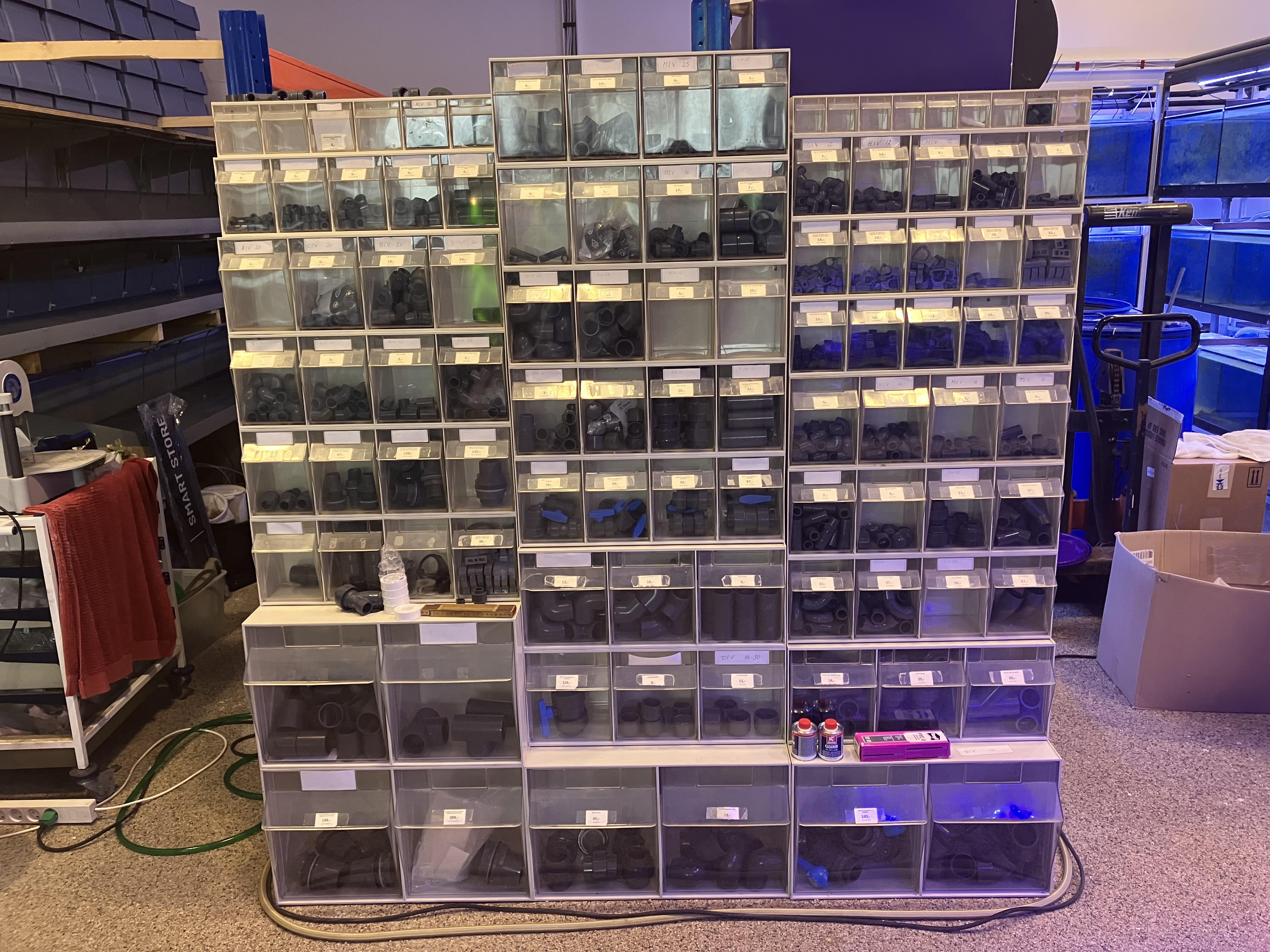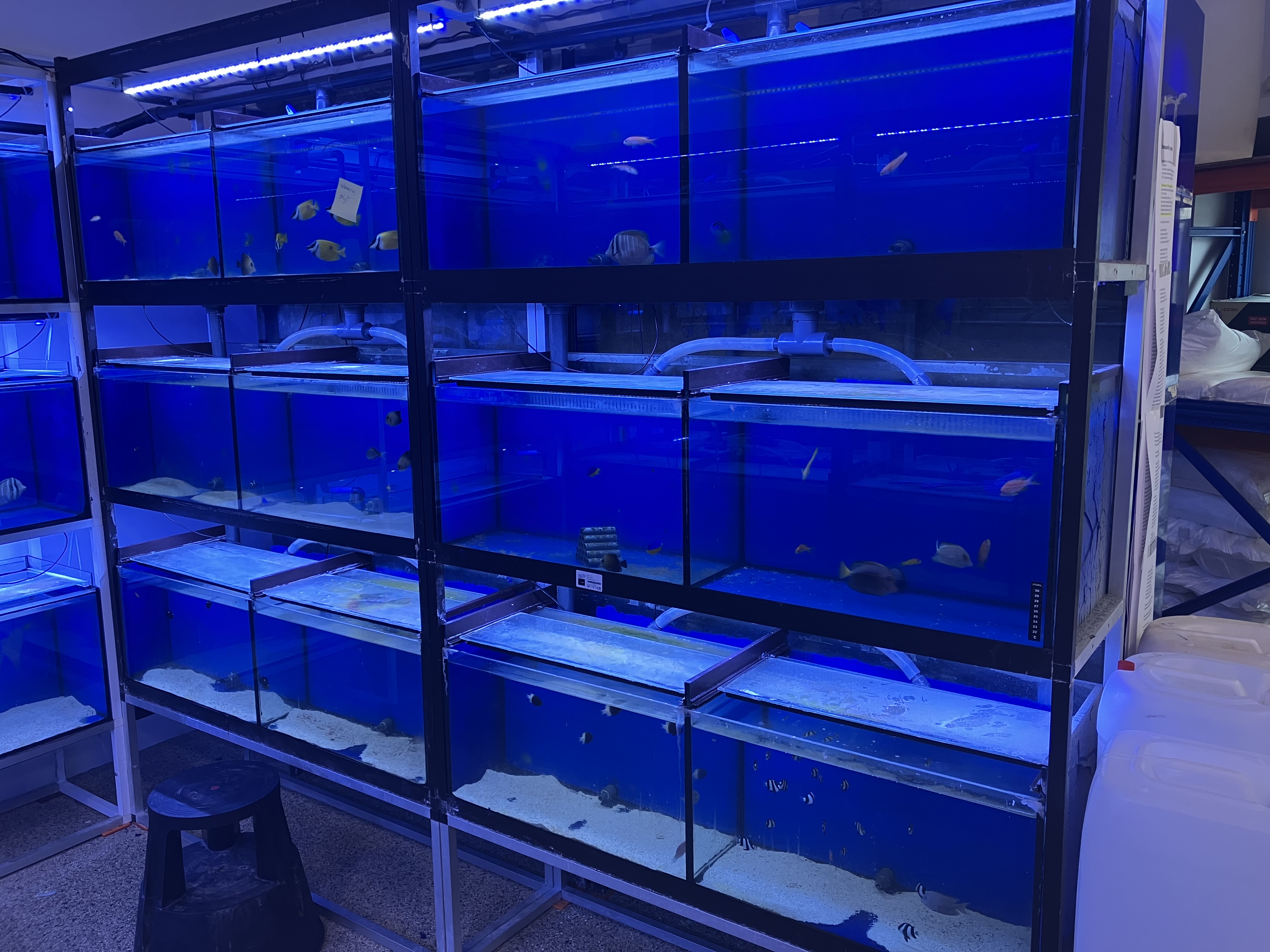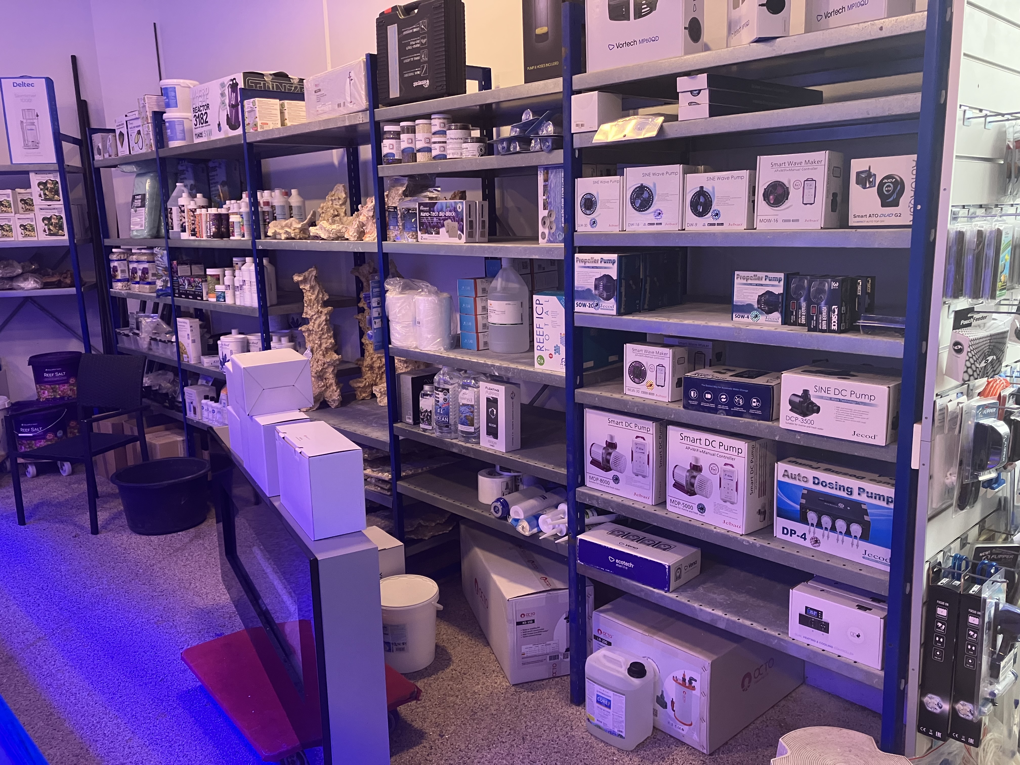 Hylderne er ved at være fyldt op med tørvarer og der er også et flot udvalg af koraller og fisk i akvarierne.