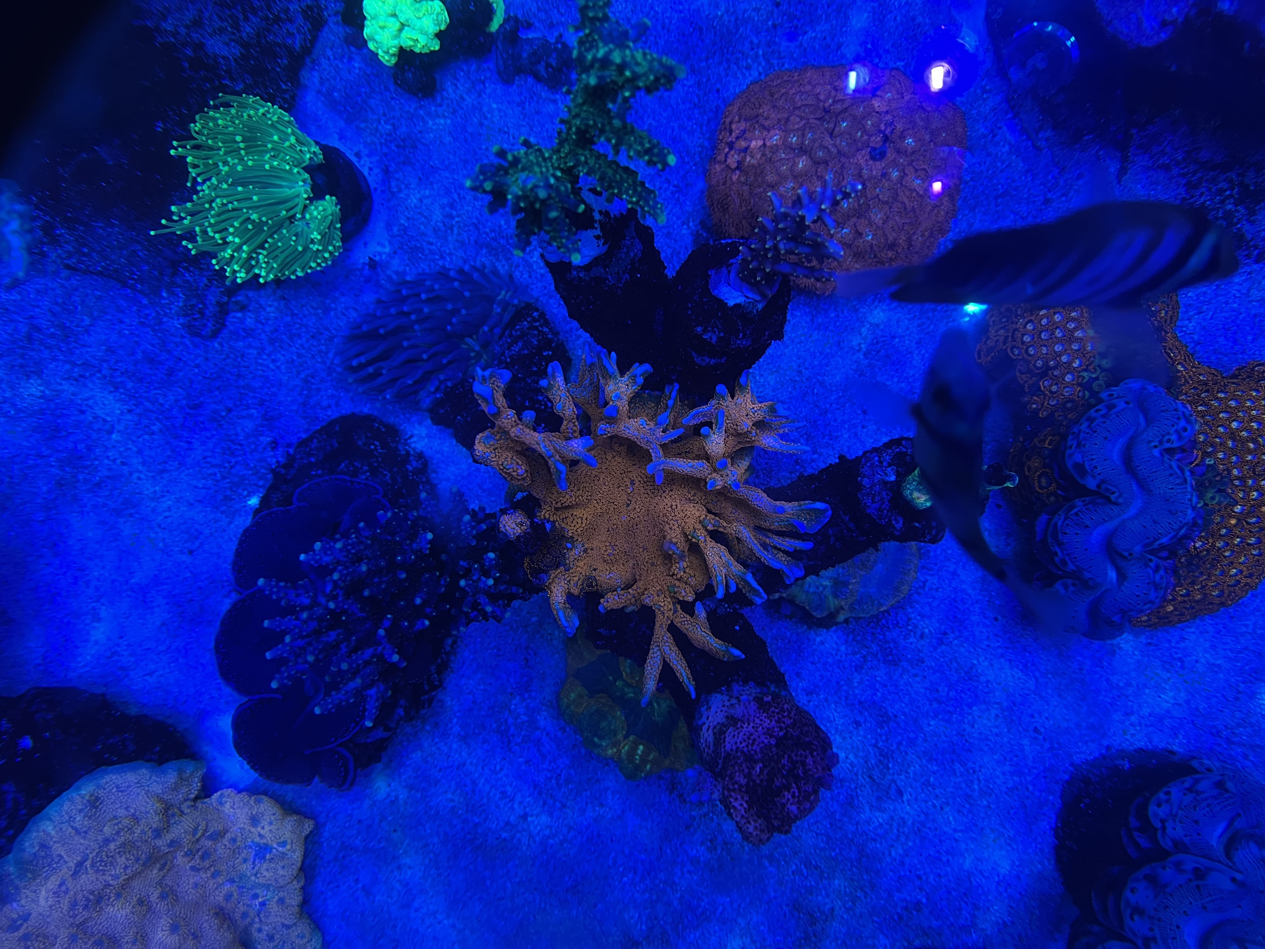Jeg har ændret lyset på Orphek lamperne sad jeg savnede noget blåt lys ved aftentid. Det har jeg godt nok fået. Her er par billeder først oppe fra igenne ko øje og så fra siden. Det er kun med blåt lys og orange filter på mobilen.