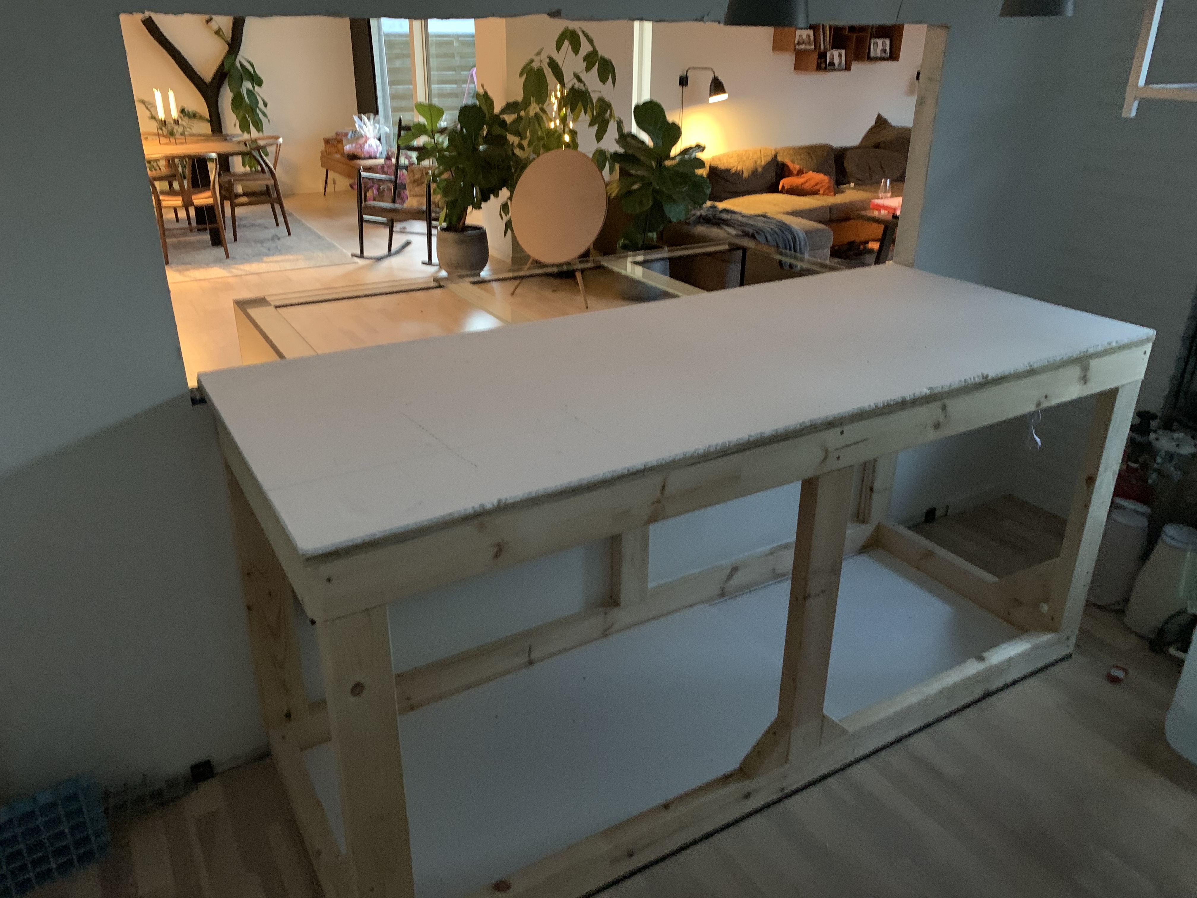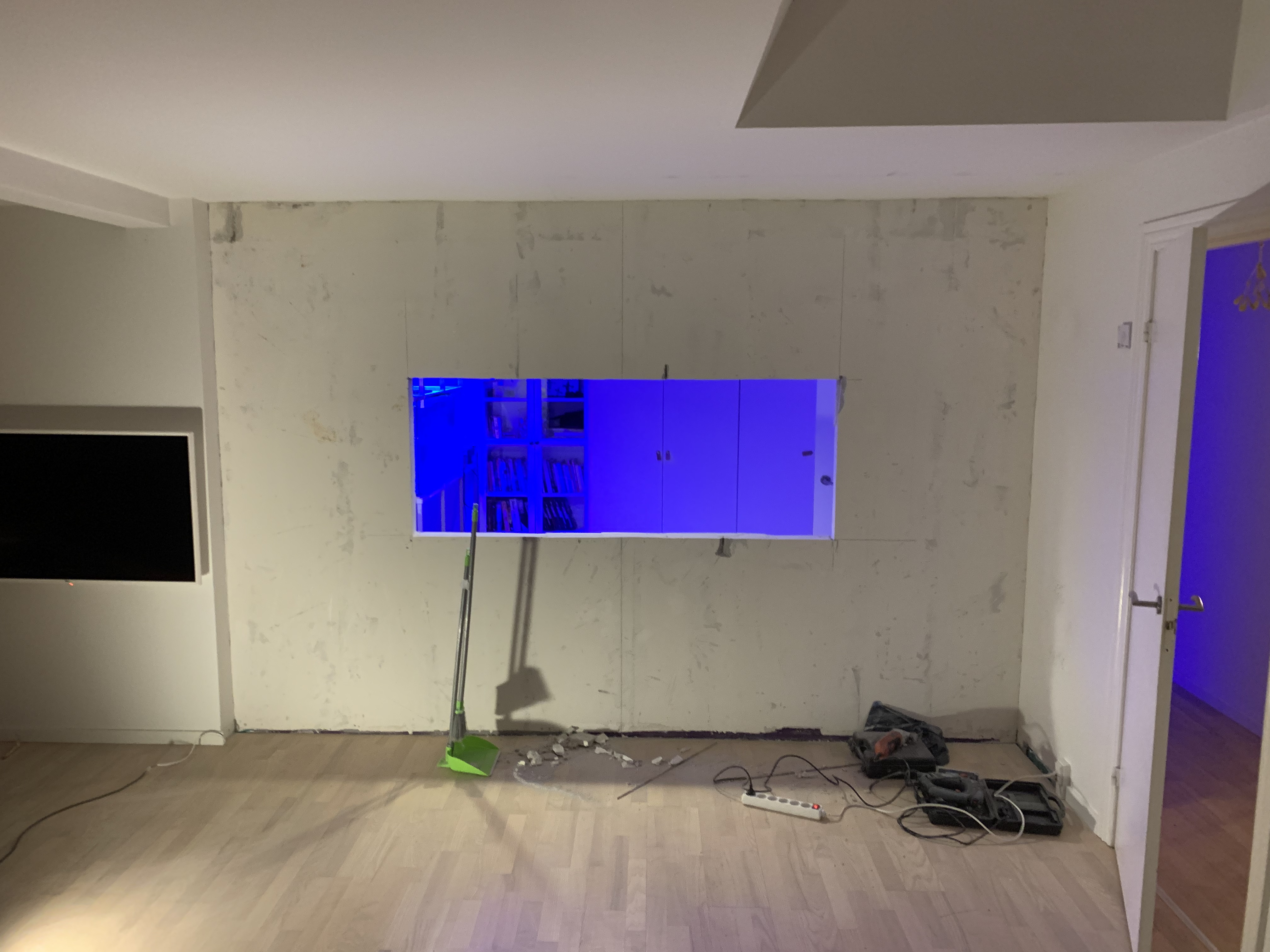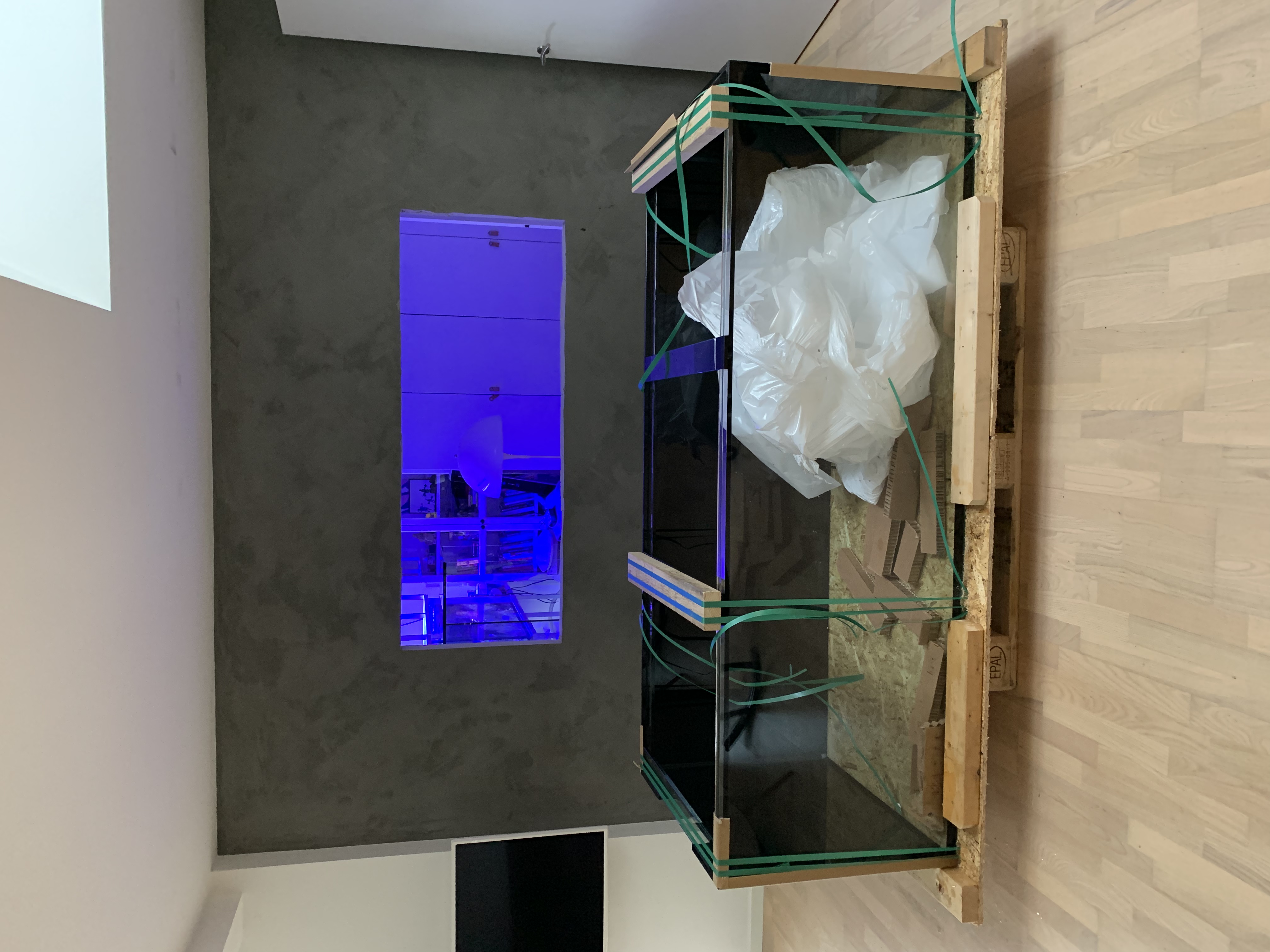Der er opbygget med en blå rist på tværs af akvariet, hvorpå der er lagt og limet sten fast.