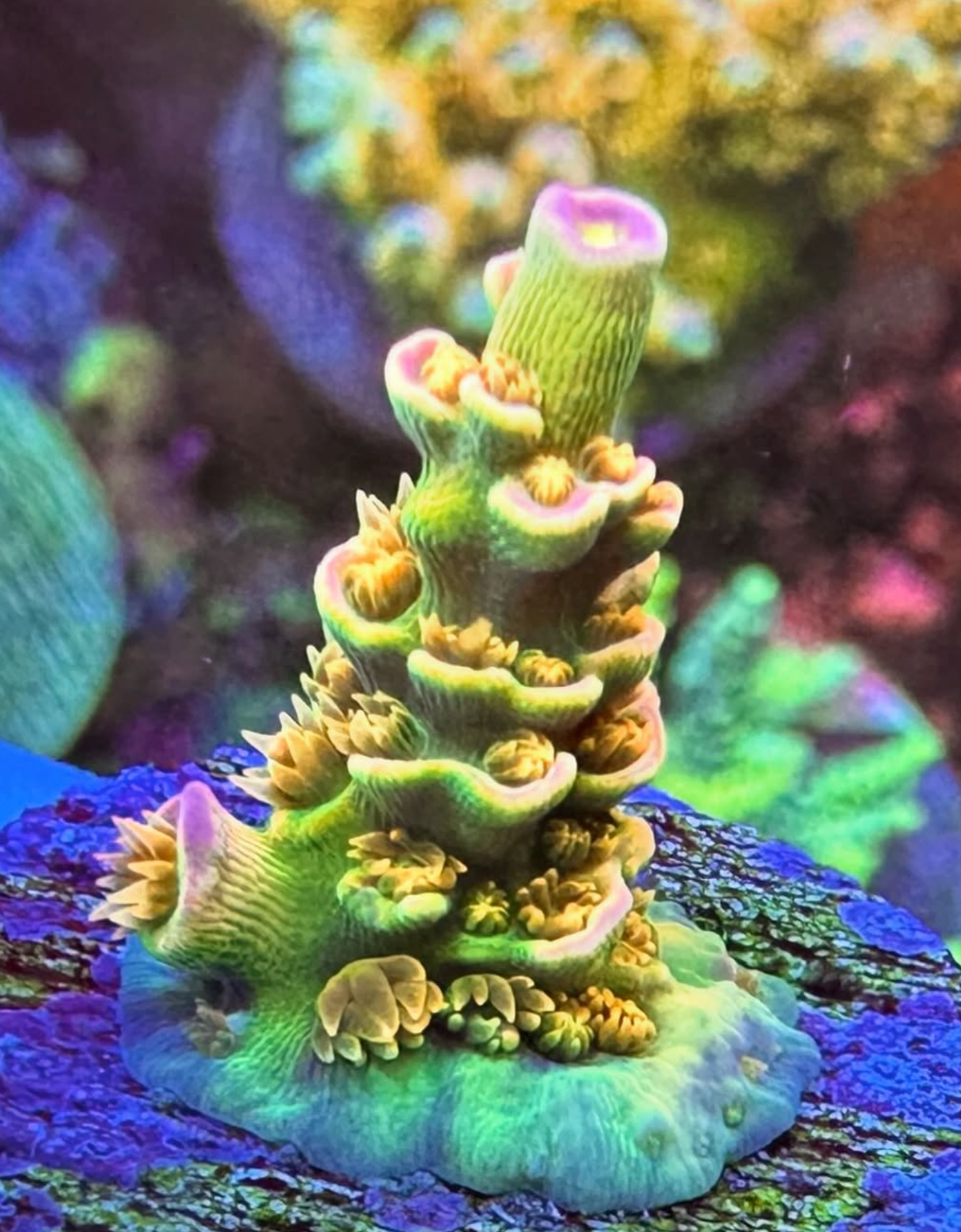 Jeg har prøvet det med en i samme klasse. En homewrecker, fik den fra SR. Han kunne heller ikke få de rigtige farver på den. Jeg fik et fragment over for at prøve. Jeg kunne heller ikke. Den røg videre til en anden erfaren reefer og han kunne heller ikke. Dette for at sige, at der ligger virkelig meget arbejde i den type koraller - og succes er ikke en selvfølge. Og så kan man ikke udelukke en vis portion held.