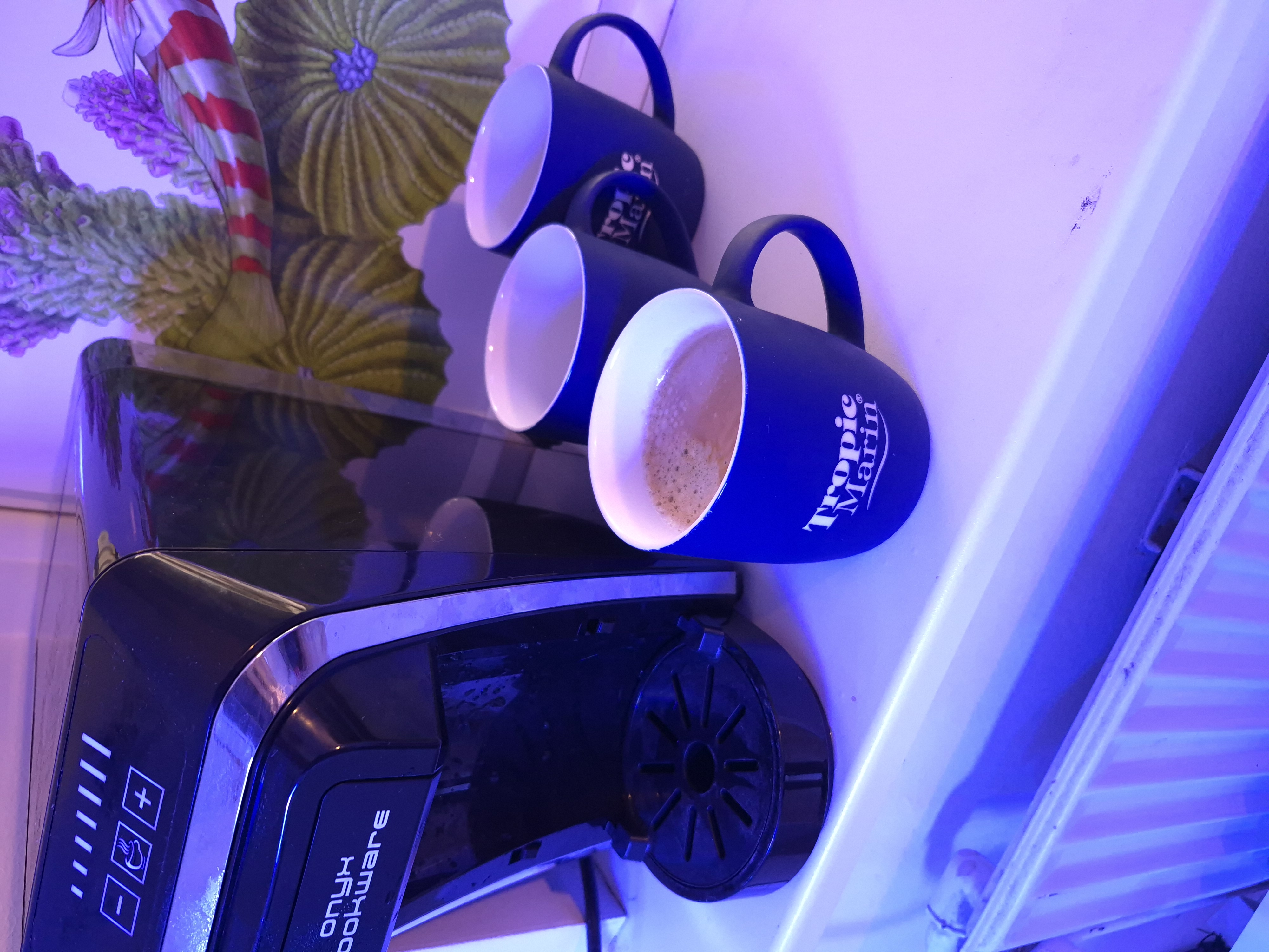 Som noget nyt har jeg installeret en lille kaffemaskine, så de der timelange akvariesnakke ligeså godt kan nydes med en kop mocha.