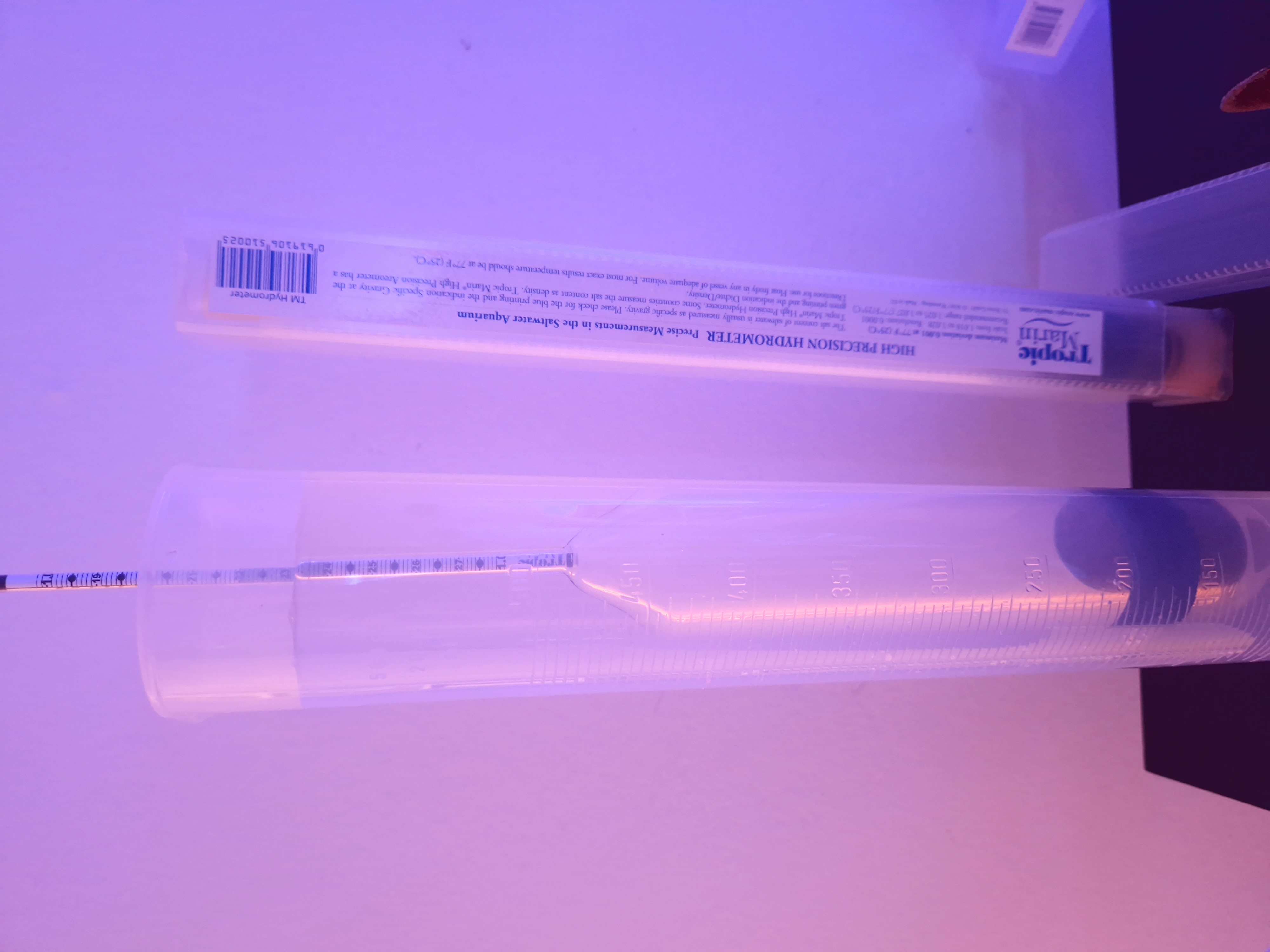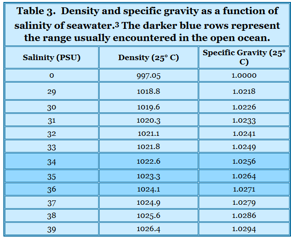Opdateret med tabel:Jeg benytter netop dette hydrometer i density-versionen med et PVC målerør. Det er let og hurtigt, og det sikrer en stabil salinitet. Da hydrometeret er af glas, har jeg lagt groft skum i bunden af røret. Er det super vigtigt at ramme en bestemt værdi som f.eks. 35 PSU ~ 1023,3 ifølge tabellen, skal man korrigere for temperaturen. Hos mig passer det fint med knap 1024, når det har stået i røret i et par minutter og mistet et par grader.