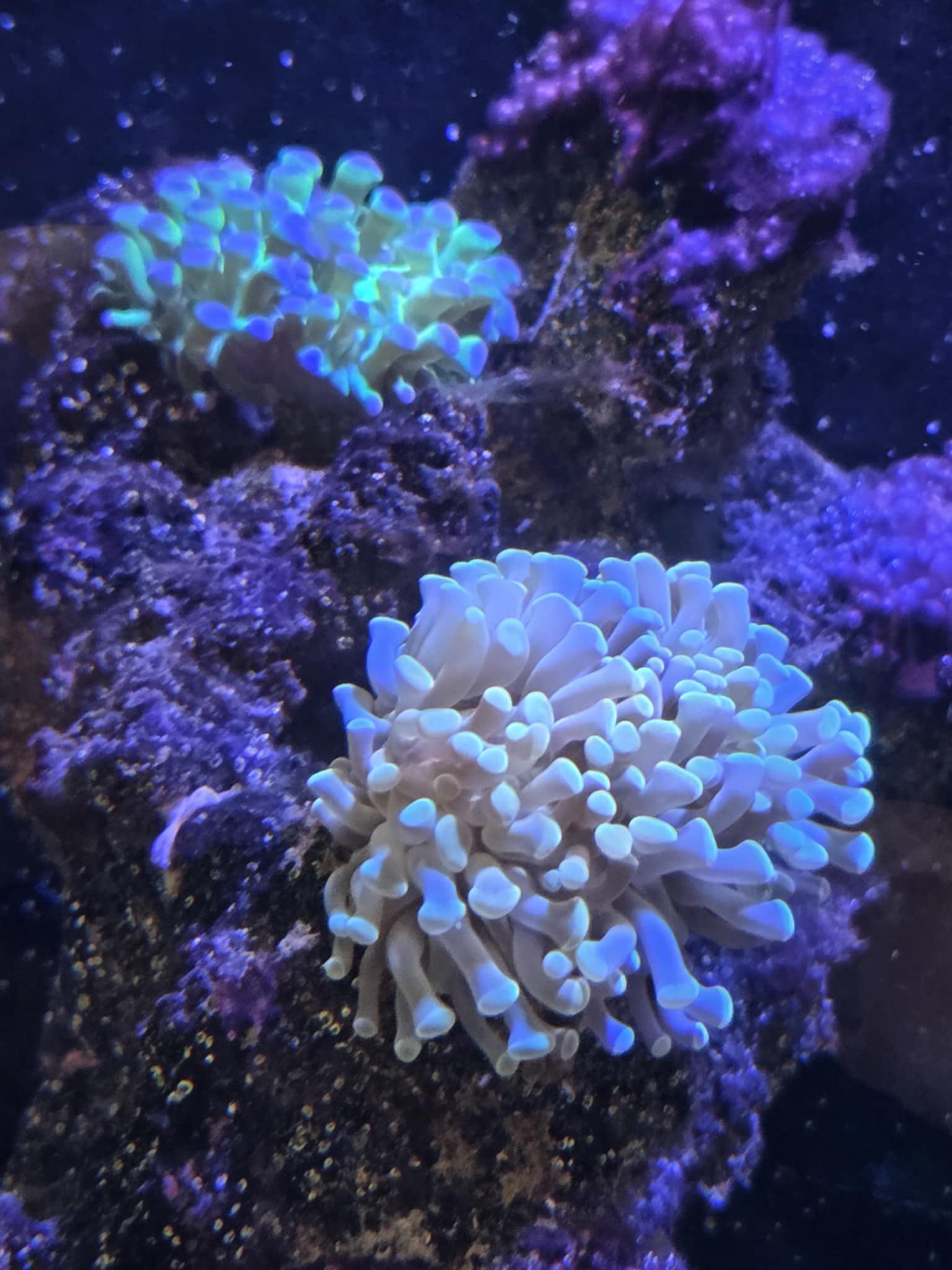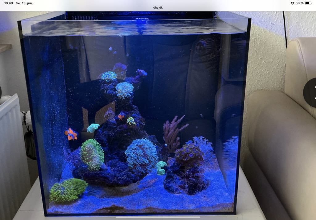 koraller ,pulsing xenia,Green star,2 stk euphyllia hammer,2 stk gorgonia,2 stk zoa, 2 stk grøn candy cane og en grønlilla, sacrophyton, Tubipora musica(pibecoral) og 1 levende sten , 2 Klovnefisk . 1 scooter blenny og 1 reje lysmata wurdemanni . 2 turbu snegle, 4 cereth .
