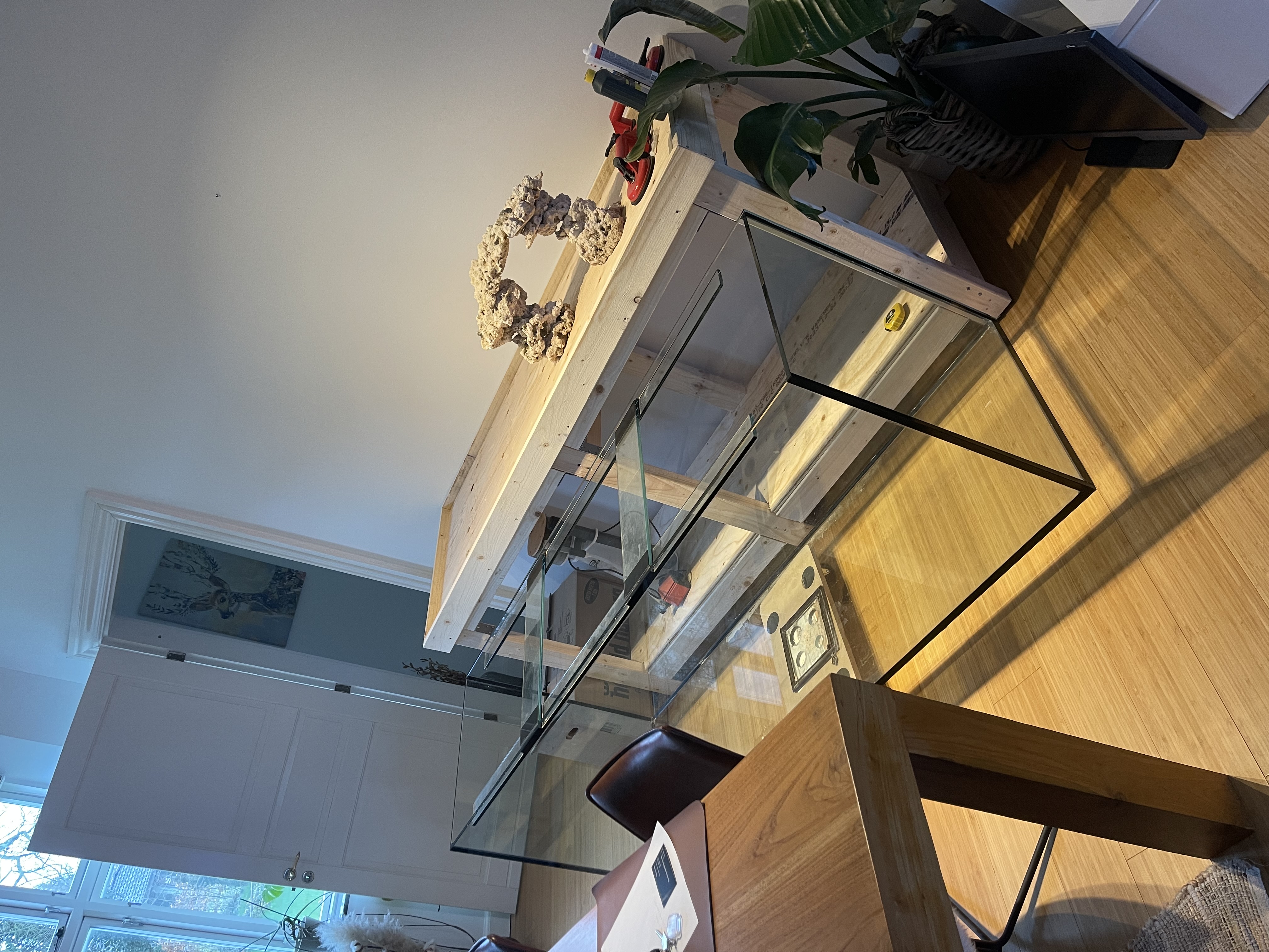Det blev til et pænt brugt akvarie på 185x60x70 med Weiss glas, som kræver lidt ændringer før det er klar. Og krævede næsten 4 mænd bare at få ind i huset😅 Indtil videre er underbordet lavet og levende (døde sten) er jeg begyndt at forme med superlim.