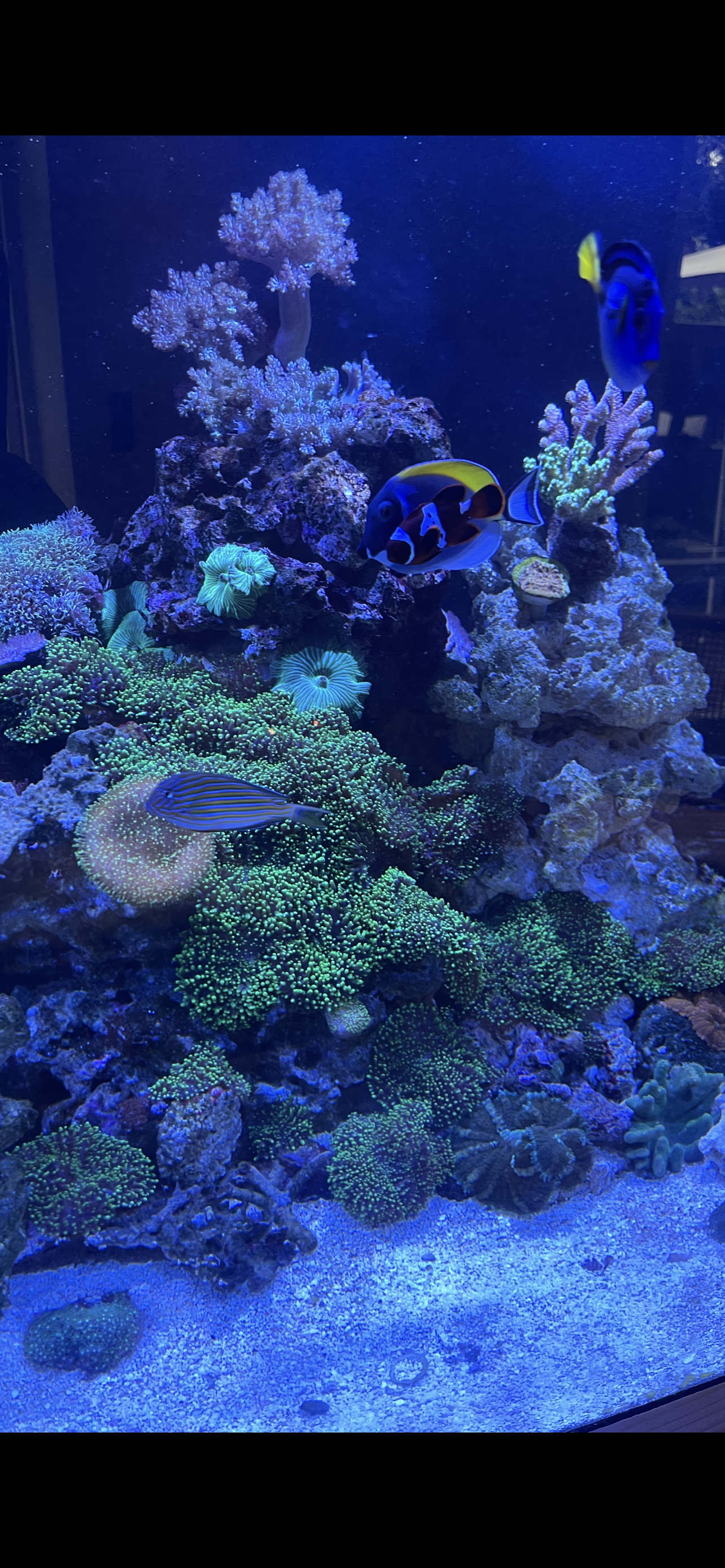 Så har akvariet kørt i 3 måneder og der er sket en del siden sidste oplæg😆. Har fået en masse blød koraller og sten fra et akvarie som har kørt i 5 år og har selv været ude at prøve og købe lidt småt af lidt lps og sps. Og så er jeg tilfreds med den fiskebestand der er indtil videre, som primært er ungfisk ☺️ så nu er det bare at det skal nydes for nu og blive yderligere modent og vokse samt forhåbentlig holde værdierne så vidt muligt stabile nu det stadig er et forholdsvis nyt akvarie 🤞🏼 håber i kan lide det😊