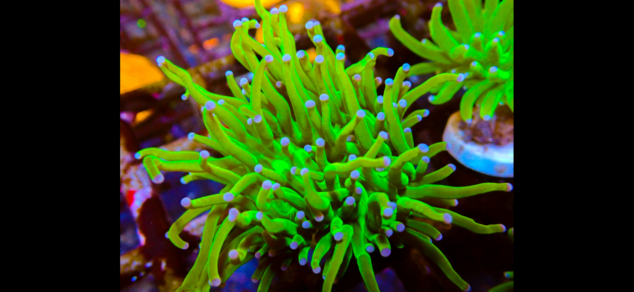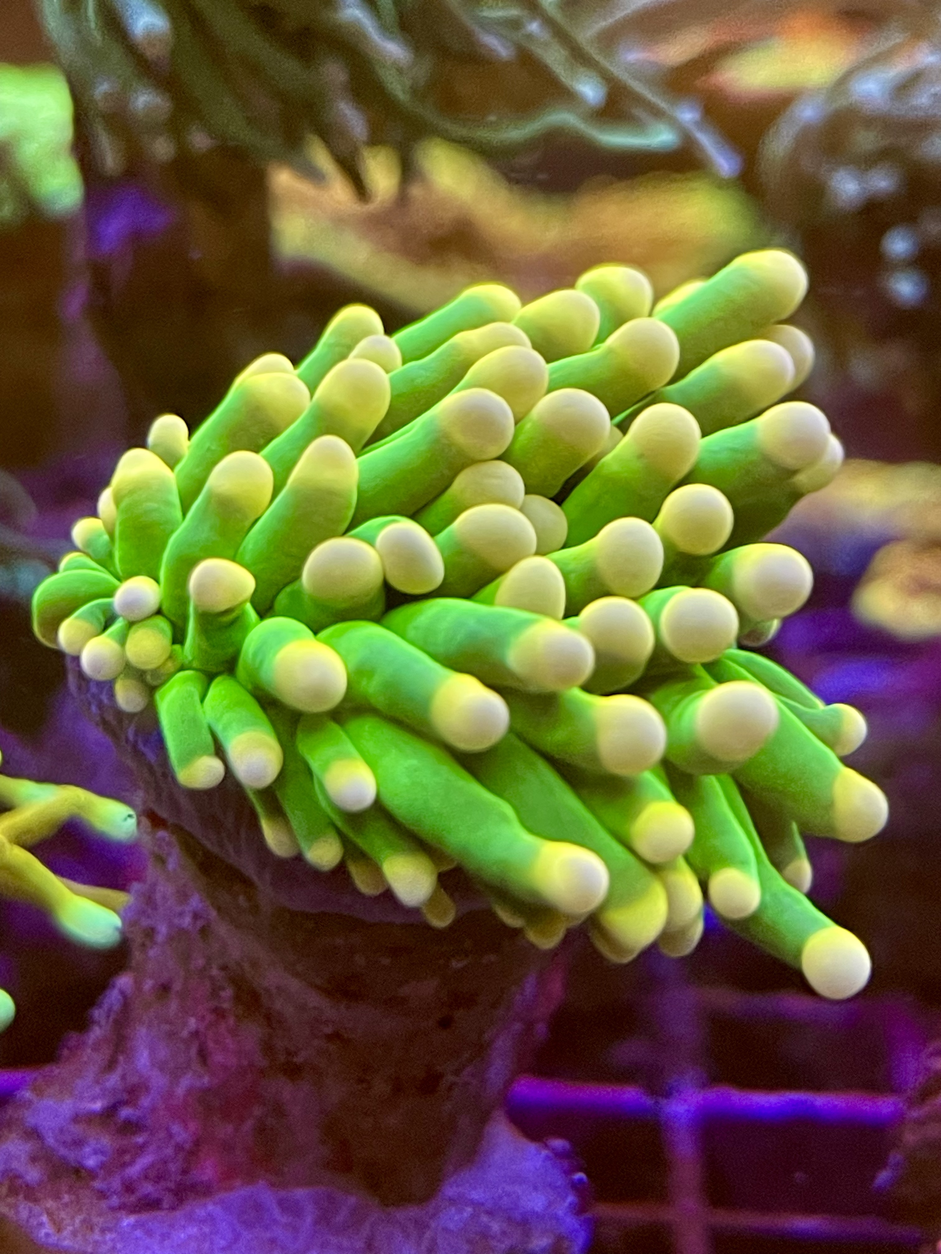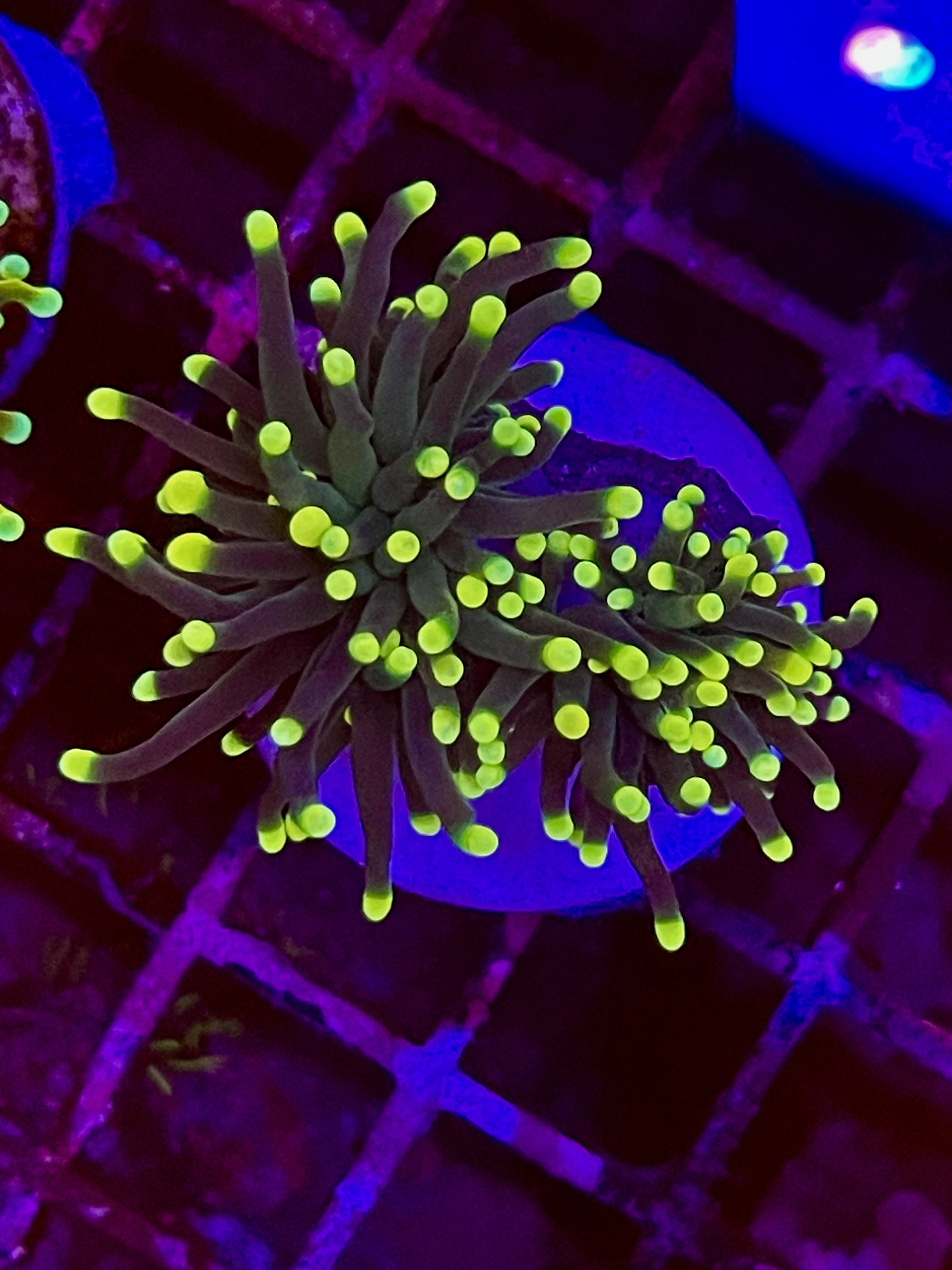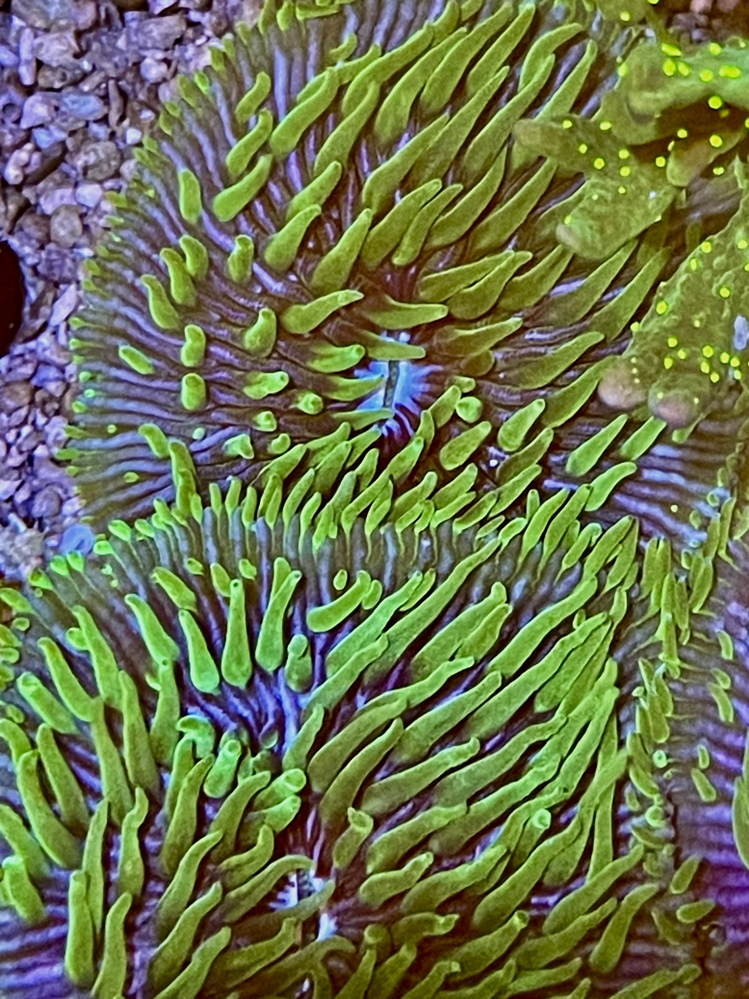 Fungia med skrig grønne polypper. Sælges som sæt, dvs en af hver, til 1000kr