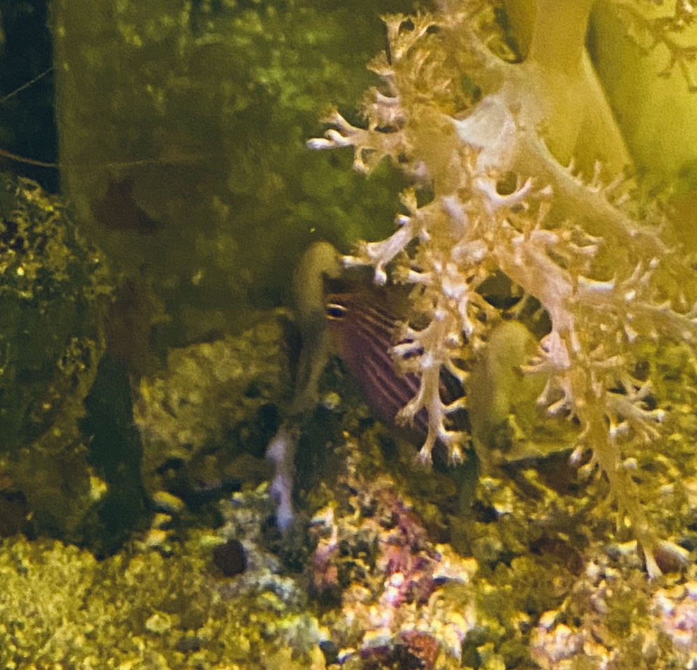Opdatering på vores seksstribet gylte (Pseudocheilinus hexataenia), som vi har haft af 2 omgange, hvor de bare har været forsvundet. Efter en rengøring bag akvariet blev de 2 fisk fundet. Døde og indtørret, dette selvom vi har net over akvarie i det daglige, men dog ikke når der bliver gjort vedligeholdelse i akavariet. Måske når der bliver trimmet xenia coral.