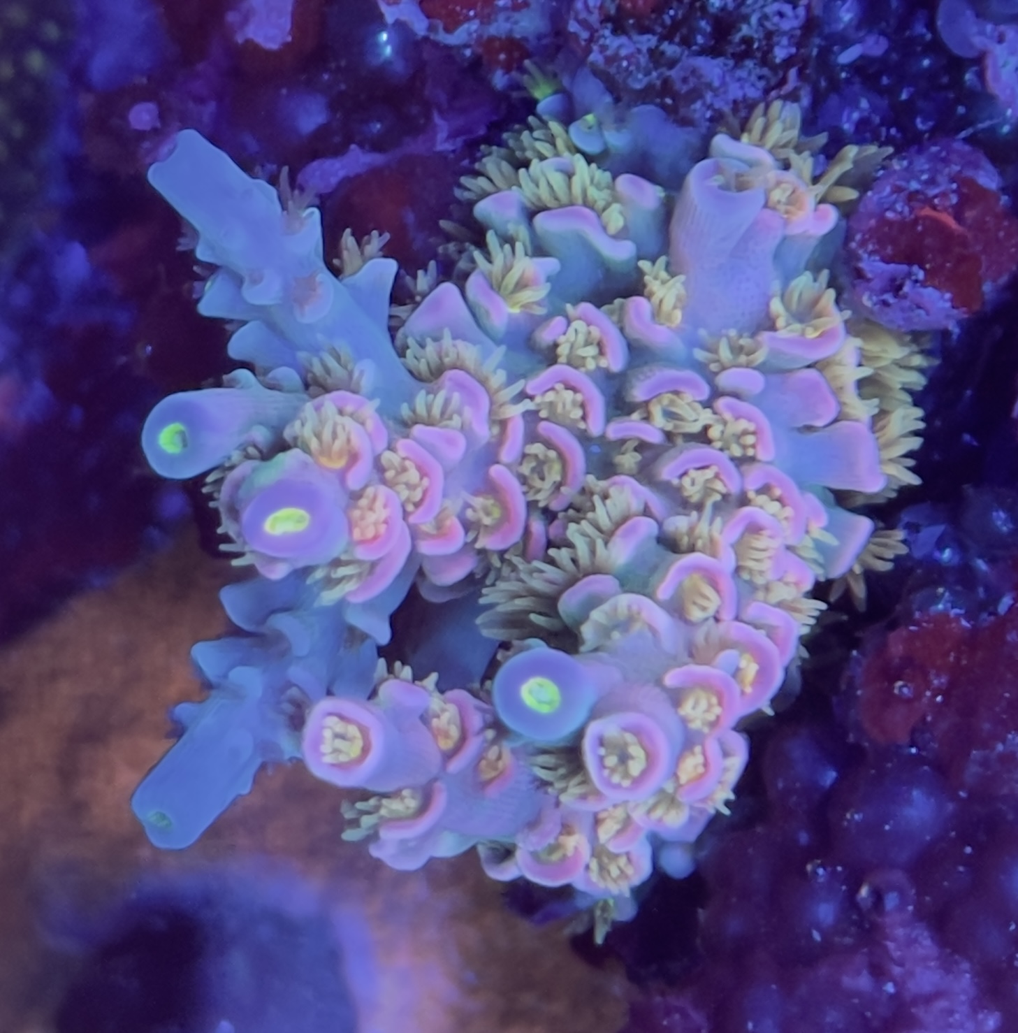 Acropora Microclados Sp “EC Red Devils” Fragmentet, koloni er i hovedakvariet