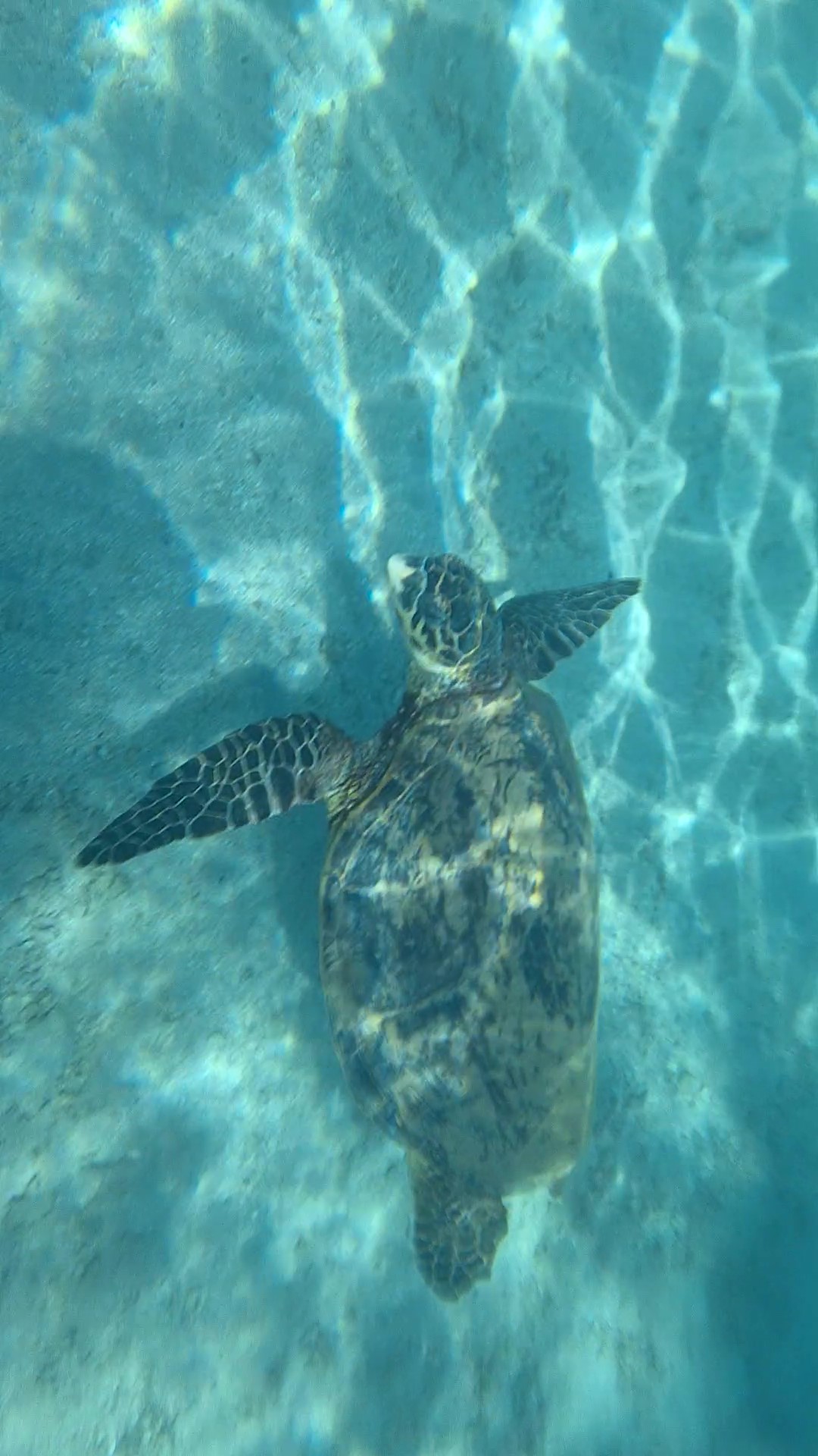 jeg snorklede rundt og kikkede på fisk og koraller ude på kanten af revet hvor vandet gik fra ca 1 meter vand til +10 meter og lige pludselig var jeg samme dem dette fantastiske dyr. jeg havde fornøjelsen af den ca 30 minuter hvor den bare svømmmede rundt og flere gange kom det helt op til mig og kikke efter mig det virkede som om det var helt tryk med jeg var der..