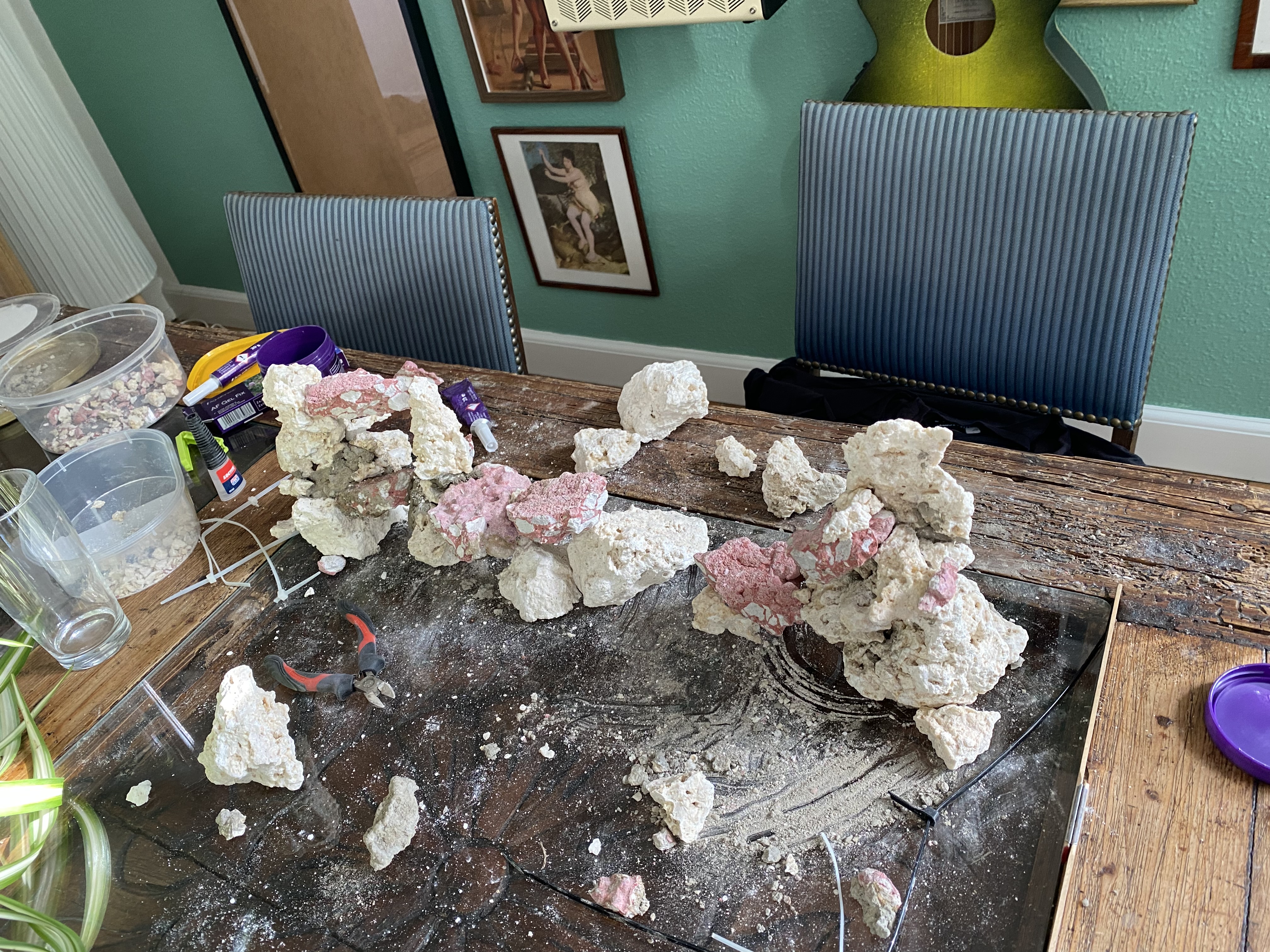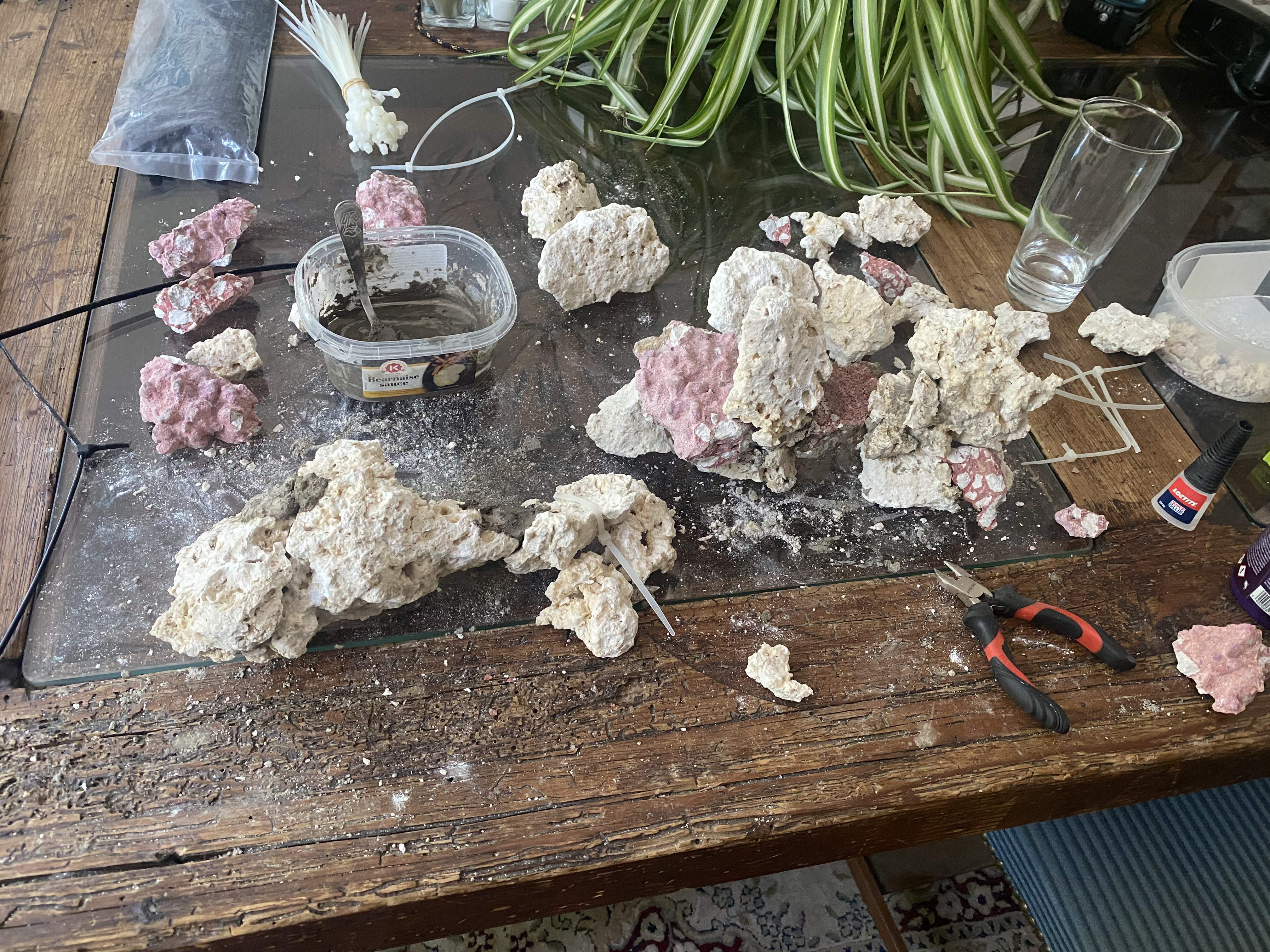 Smid stenene i en tønde eller balje og lad det køre med en lille pumpe- så er de fyldt med liv og klar, når du får limet akvariet.