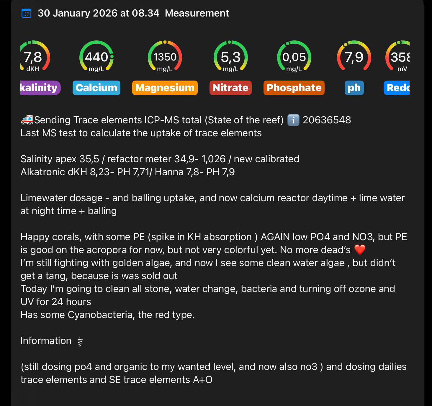 Jeg skal bestemt ikke klage, for KH er virkelig blevet stabil. Manuelle målinger inden afsendelse af ICP. Mine næringsværdier ser pæne ud nu, men har cyanobakterier, men aftagende alger. Mangler en kirurg og lidt flere snegle.