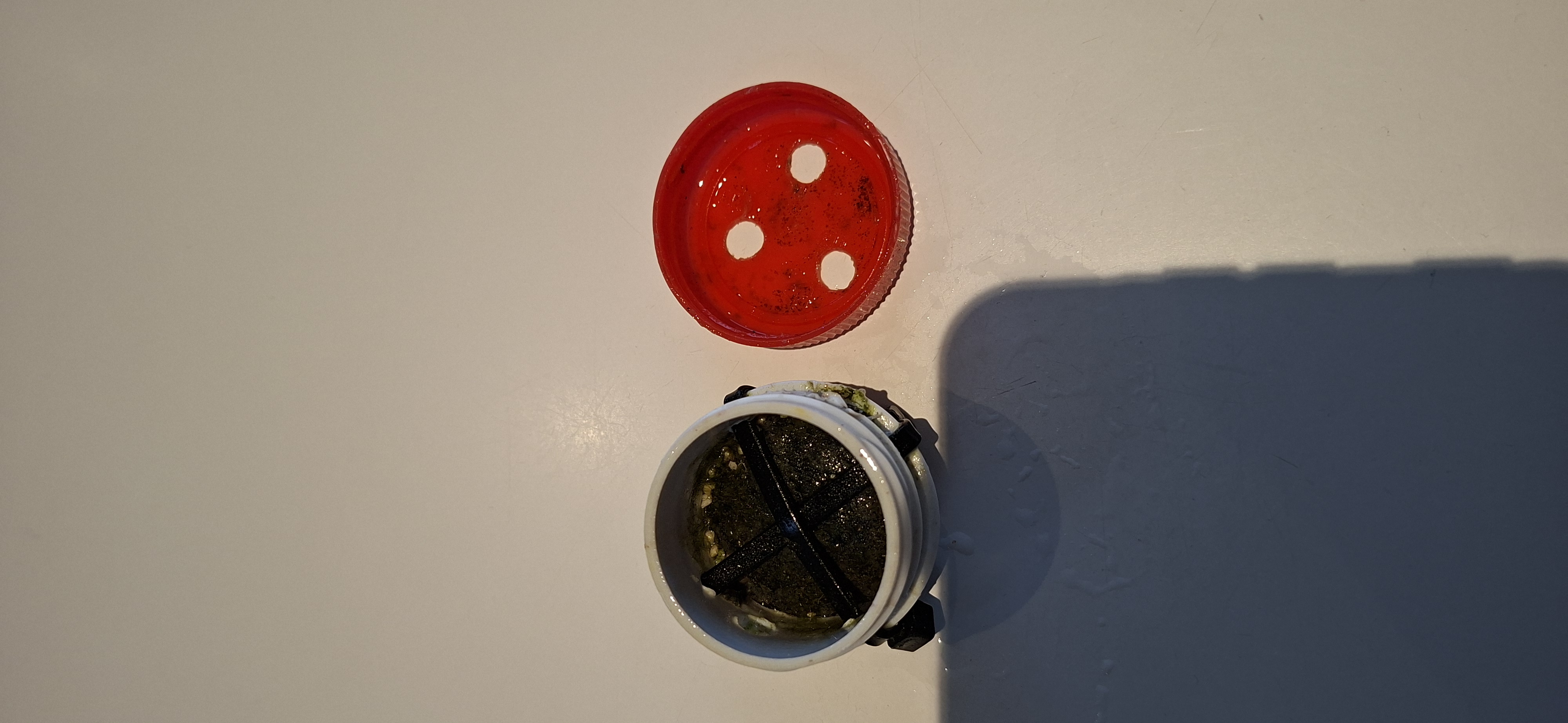 Jeg har skåret toppen med gevindet af en plastik flaske, og monteret en flad sten under og boret nogle huller i låget. Så fodrer jeg bare med mysis, atemia og blåmuslinger. Alle de andre fisk står i kø når der fodres, da de ved at det kun er pincetten der kan få foderet op