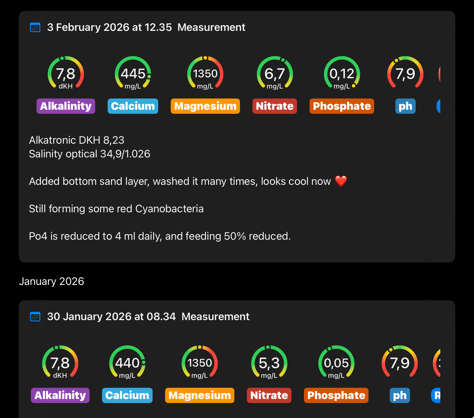 Mine næringsværdier ser pæne ud nu, men har cyanobakterier, men aftagende alger. Mangler en kirurg og lidt flere snegle.