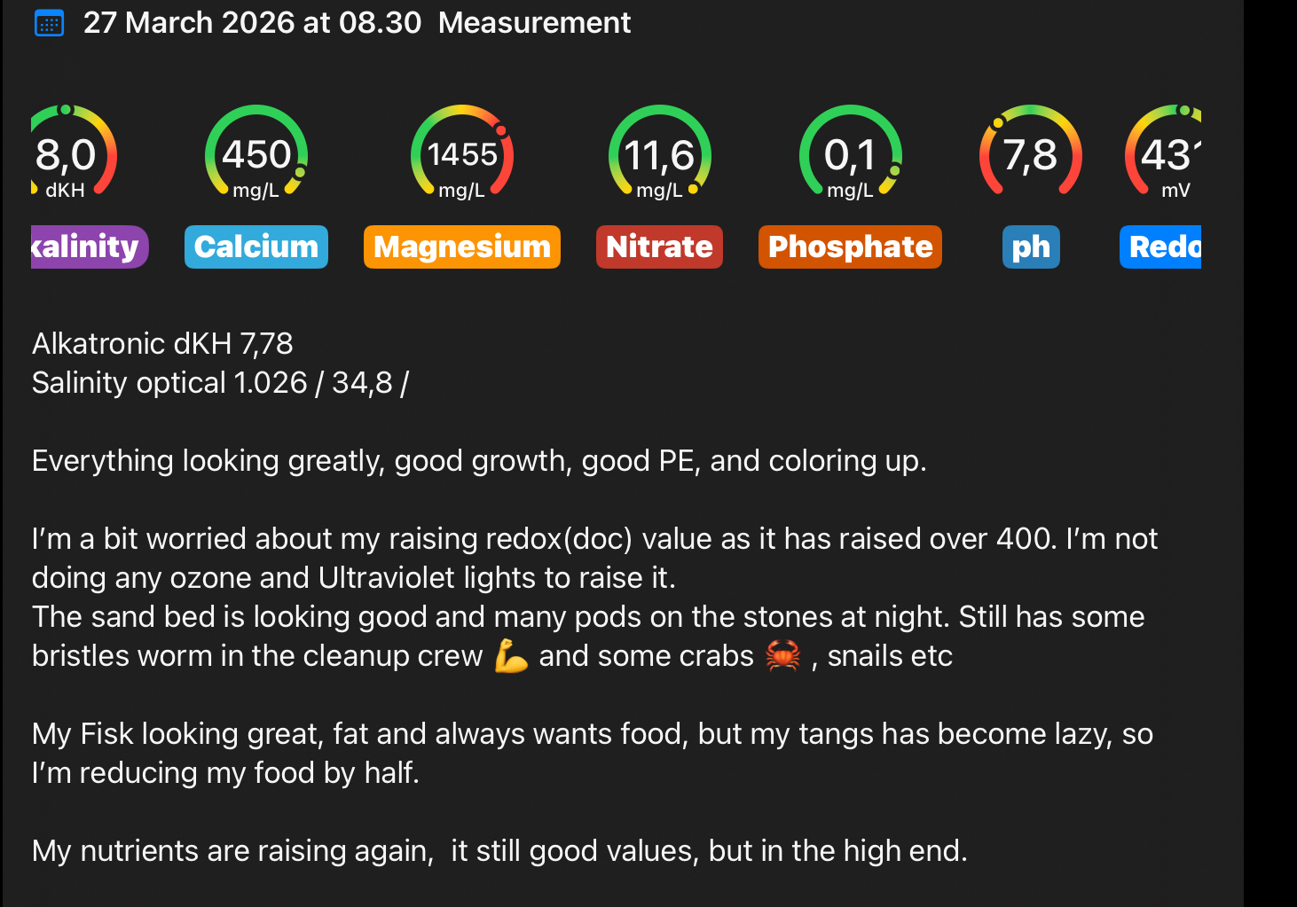 Generelt ser alt godt ud, men er blevet noget bekymret omkring min redox værdi (doc) bliver ved med at stige, selvom jeg ikke bruger hverken Ozone eller UV på mit system lige nu. Kun skummer og filtersokker.