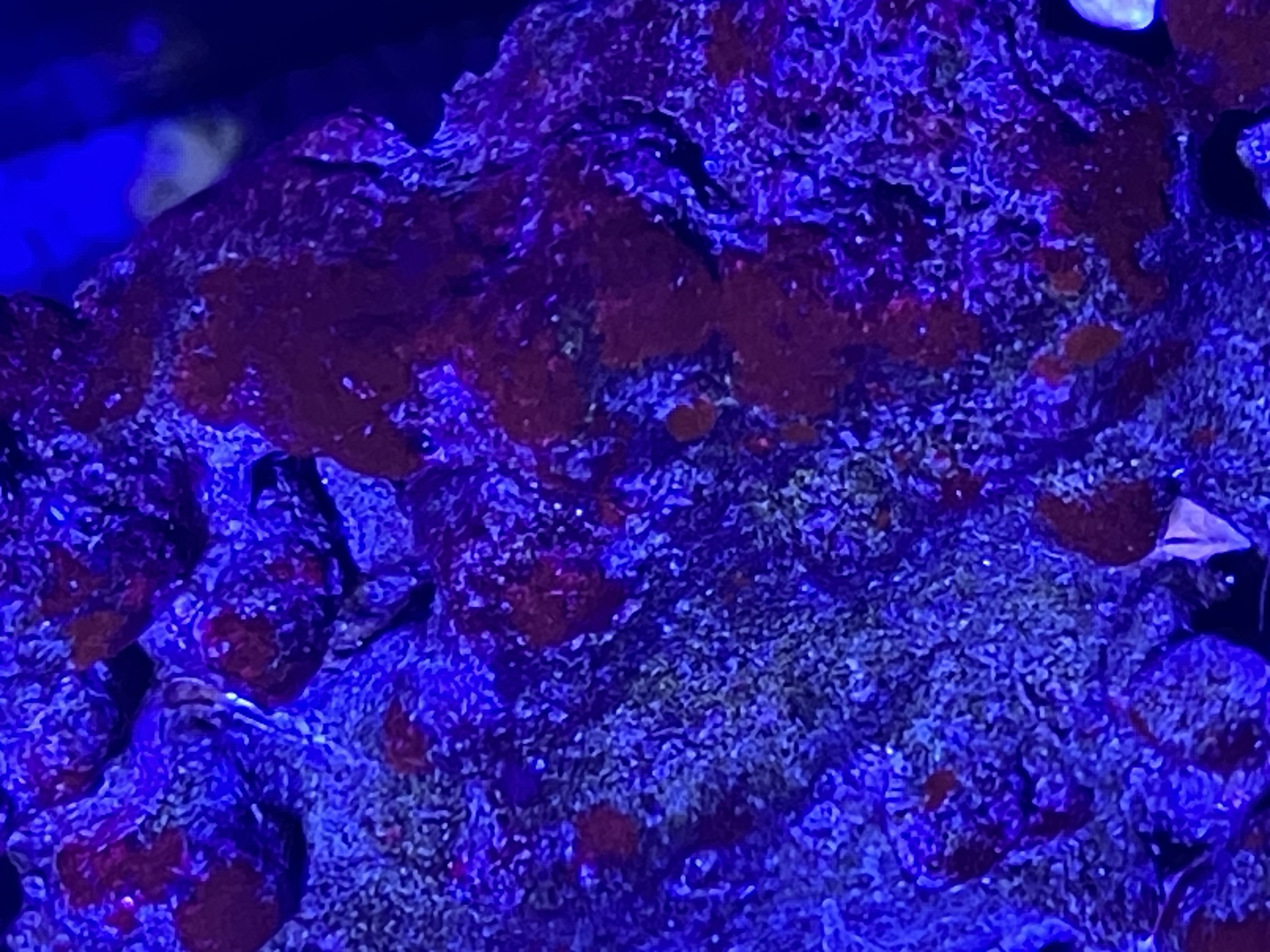 De røde kalkalger kan nogen gange være helt selvlysende at se på under blåt lys, og brækker af som kalkaflejringer hvis man prøver.